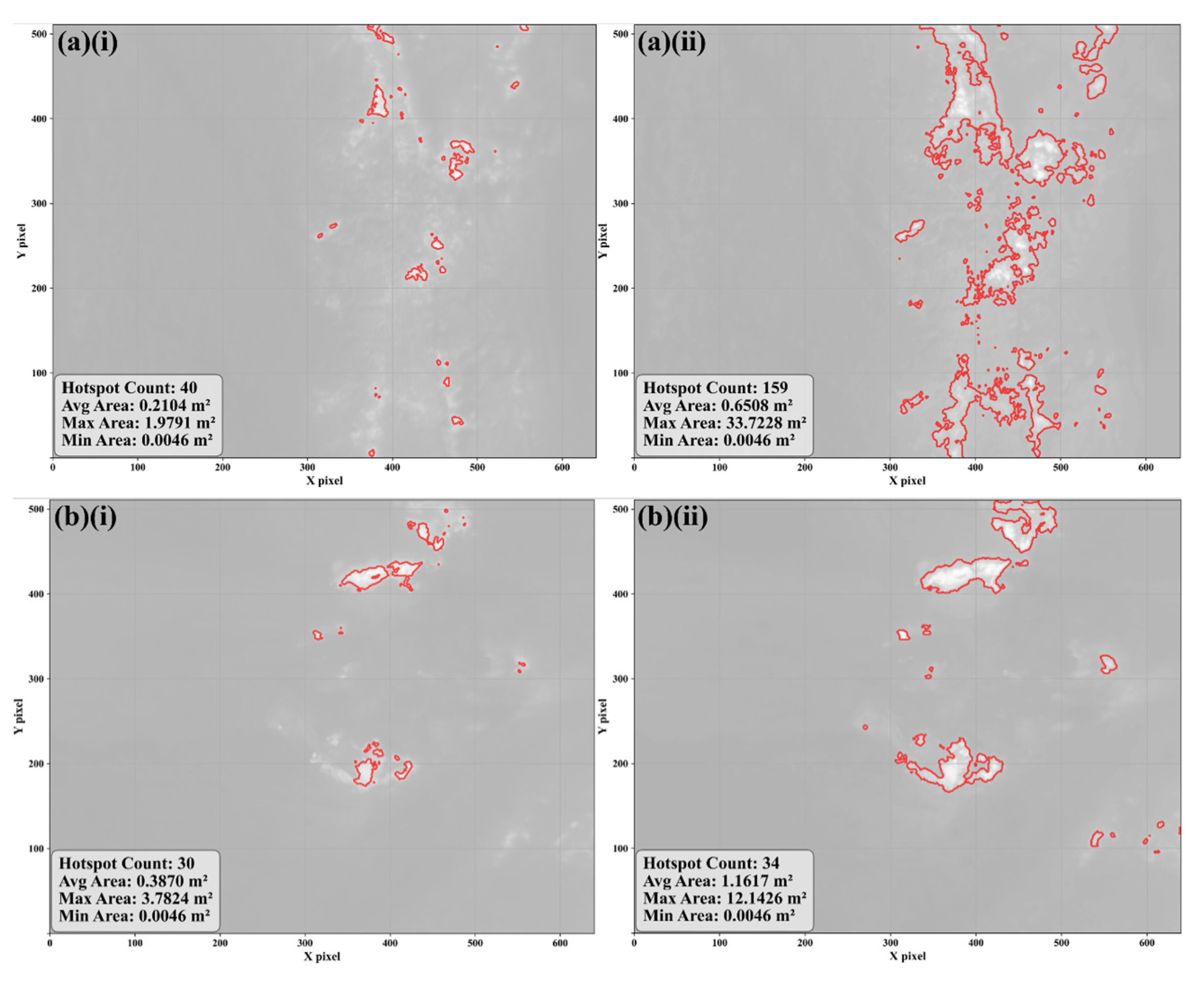 Figure 11. Comparison of extracted thermal hotspot contours before and after temperature correction. (i) Original TIR image. (ii) Temperature-corrected TIR image. (a,b) represent different observation scenarios.