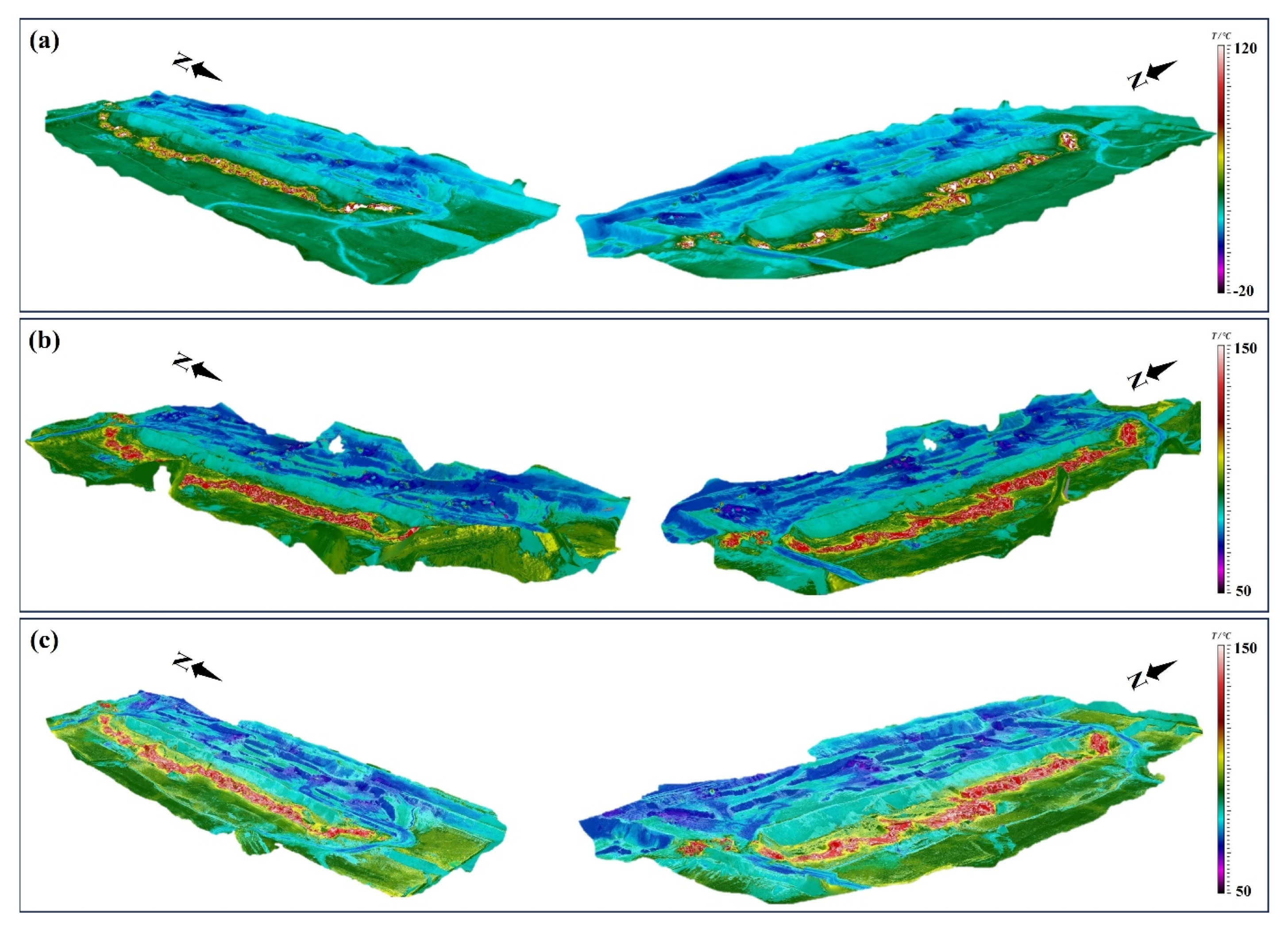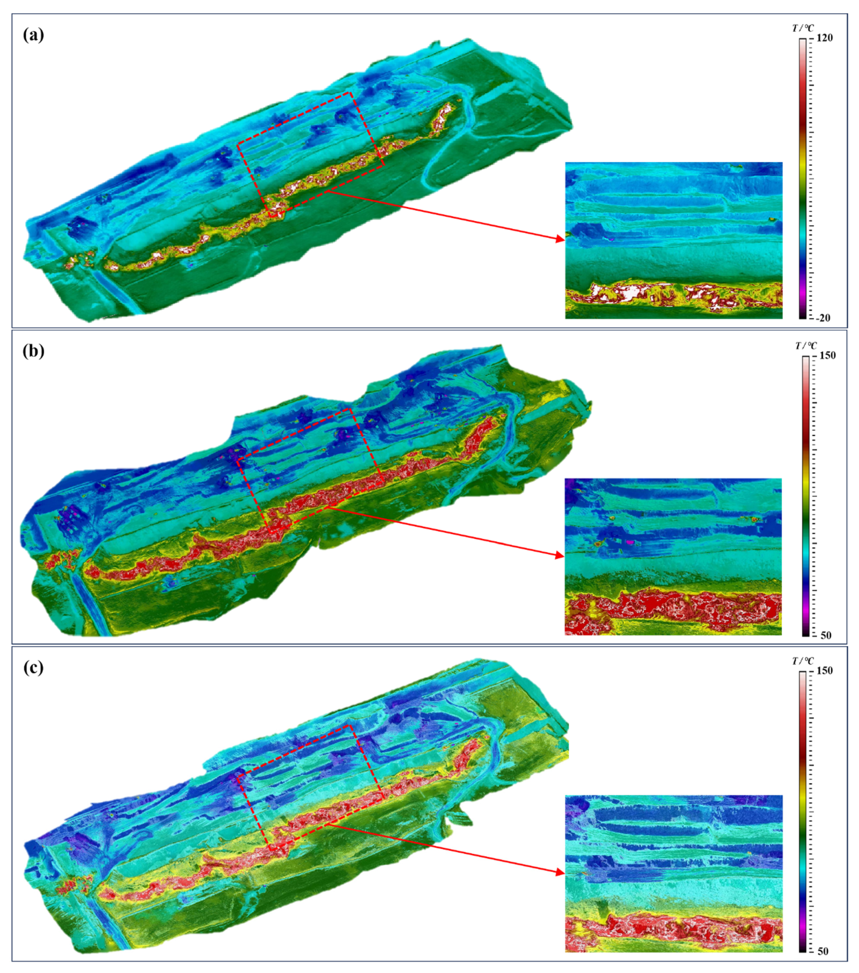 Figure 13. 3D thermal field reconstruction results of the Santanghu coal fire zone. (a) Original 3D thermal field model reconstructed from raw TIR images. (b) Corrected 3D thermal field model reconstructed from NRBO-XGBoost-processed TIR images. (c) Enhanced 3D thermal field model reconstructed from RGB-T fused images.