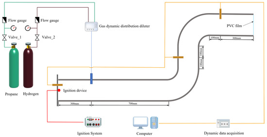 Figure 1 presents a schematic illustration of the experimental setup. The experimental system comprised segmented straight pipes, elbows, CY301 digital pressure sensors (Range: 0–100 MPa, sampling frequency: 1 kHz, accuracy: ±0.1% F.S.), a KTGD-B adjustable igniter, and LPG (Liquefied Petroleum Gas) cylinders with a propane purity of at least 95%, hydrogen gas cylinders with a hydrogen purity of no less than 99%, a dynamic data acquisition system, a gas dynamic gas mixing and dilution instrument, and valves. The specific models are shown in Table 3. The pipe’s left end was closed off using a steel plate equipped with five 20 mm threaded holes. The ignition end was placed at the center hole of the steel plate. The remaining holes can be used for connection with other experimental equipment, such as pressure sensors. Additionally, each small pipe section featured a 20 mm aperture at its central top section, facilitating equipment connections such as gas inlet ports. The pipe’s end was closed off using PVC (Polyvinyl Chloride) film to avoid gas leakage prior to ignition during the experiment. The pressure sensors were positioned respectively at the hole locations 30 mm to the right of the ignition end, 100 mm to the left of the second pipe section, and 100 mm to the left of the third pipe section.