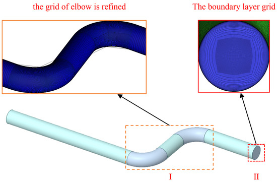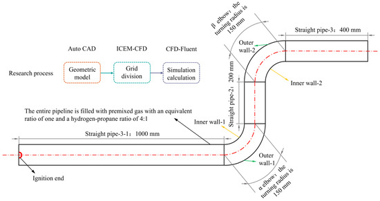 The pipe wall of the elbow model shown in Figure 2 was set to be non-slip. Because the explosion test was completed in an instant and lasted for a short time, its impact on the temperature of the inner wall of the pipeline was negligible. To simplify the model calculation and improve the simulation efficiency, the boundary condition of the pipeline was set as the adiabatic wall boundary condition. To prevent pressure attenuation caused by pressure wave reflection, the pipe outlet was set to be non-reflective. The necessary parameters required for the calculation included the kinematic viscosity, thermal conductivity, and laminar flame velocity of the premixed gas. The laminar flow flame velocity was experimentally measured by Tang et al. [52] and set at 0.706 m/s. The thermal conductivity evaluated by the polynomial function of the fifth power of temperature was approximately 0.068 W/(m·K) [53]. Based on Sutherland’s visibility law [54], the viscosity was set at 1.76189 × 10−5 kg/(m·s). The initial temperature was set at 297.15 K. The initial relative pressure inside the pipeline was set to 0 MPa [55], and the initial velocity and reaction process variables were all set to zero. To control the pre-flame stretching and quenching, the critical strain rate was set at 5 × 10−4. At the ignition end of the elbow pipe model, a spherical ignition area with a diameter of 10 mm was captured [46], and the reaction process variable c within the region was set to 1 to simulate the ignition function.