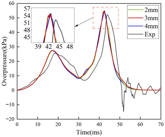 First, the geometric dimensions of the pipeline on the Auto CAD 2020 software platform were defined. Then, the mesh model and size details were generated through the ICEM CFD 2021 R2 software. Given that the structural grid enhanced the accuracy and convergence of computational outcomes, it was employed to partition the fluid computational domain as shown in Figure 3. Considering both computational cost and accuracy, three grid sizes (2 mm, 3 mm, 4 mm) were selected to analyze and verify the grid independence of the model (as shown in Figure 4) [50,51]. By comparing numerical simulation results with experimental data, it was observed that when the grid size was 3 mm, the simulated results most closely matched the experimental findings. This study focuses on investigating the influence of elbow angle on hydrogen-propane explosion characteristics. To obtain more precise simulation results at the elbow section, a refined 3 mm × 3 mm × 3 mm grid was employed for this region (Figure 3I). In Figure 3II, a boundary layer mesh was employed to partition the computational domain near the pipe wall. Mesh density gradually decreased along the boundary layer direction. The first layer had a height of 0.1 mm. The expansion coefficient was set to 1.2. Mesh density progressively decreased along the boundary layer. Furthermore, constrained by computational resources and time limitations, a 5 mm mesh size was employed for the straight pipe section to implement a gradient mesh refinement strategy. This approach effectively balances computational efficiency with simulation accuracy requirements. Specifically, a gradient mesh design was adopted for the straight pipe region, where the mesh size gradually transitions from 3 mm at the elbow to 5 mm. This transition was achieved by controlling the expansion ratio and number of layers. This ensured a smooth variation in mesh density, preventing numerical oscillations caused by abrupt size changes. This strategy significantly reduced the overall number of meshes, substantially shortening the duration of each simulation run. Figure 4 illustrates the longitudinal distribution details of the gradient mesh in the straight pipe section, showing the mesh uniformly expanding along the axial direction, fully accommodating the evolving characteristics of the explosive flow field.