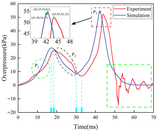 At the P3 position, when the pressure rose again to the second peak, the simulation curve accurately captured a slight pressure fluctuation. However, the experimental data did not record this phenomenon. This was mainly due to the accuracy limitation of the experimental pressure sensor. Because the sampling interval was greater than the frequency of pressure changes during this rapid response period, it was impossible to analyze such subtle changes. During the final phase of the explosion, positive and negative pressure fluctuations appeared on the experimental curve. These fluctuations were not captured by the simulation. They resulted from the combined effects of several real-world factors absent in the idealized numerical model. These include: (i) Complex three-dimensional transient flow phenomena (e.g., secondary flows and vortex shedding at pipe junctions), amplified by non-ideal wall conditions such as surface roughness and sedimentation; (ii) Minor flow disturbances at pipe joint interfaces; (iii) Low-amplitude environmental noise, such as background vibrations and electronic noise within the data acquisition system. Simulations conducted under adiabatic and hydraulically smoothed assumptions naturally filter out these real-world complexities, resulting in a smoother pressure decay profile. From the perspective of the overall pressure change trend, the relative error between the simulation and experimental results was relatively small. The average relative error was controlled within 5%. Further, through the comparative analysis of multiple repeated experimental data, it was confirmed that the numerical simulation results had good repeatability and stability.