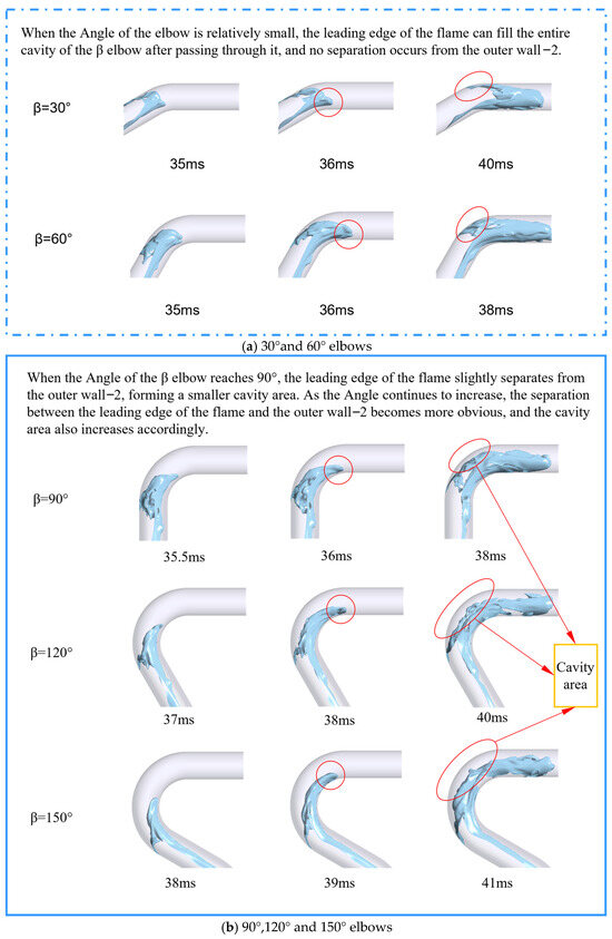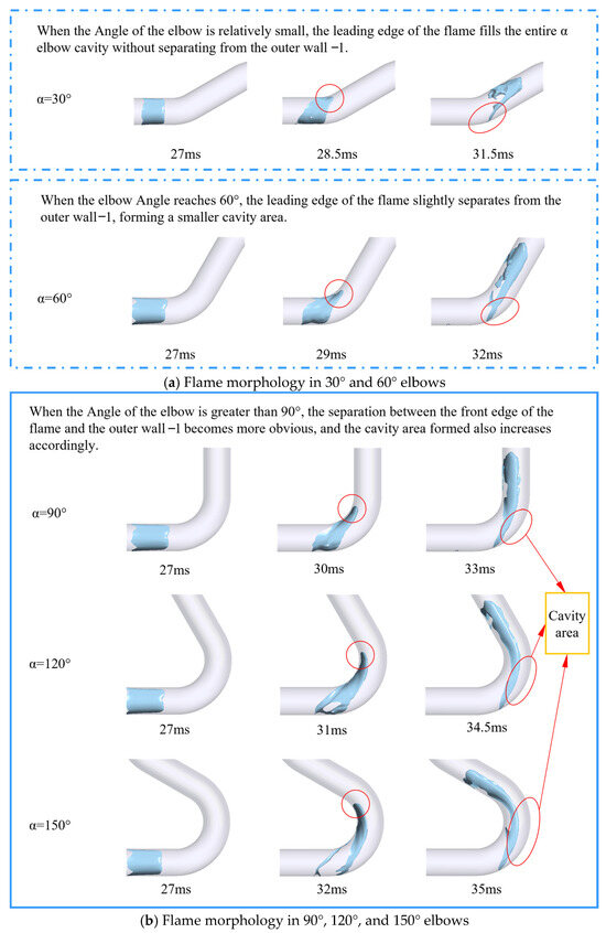 As shown in Figure 6a,b, the transient process was captured when the flame front passed through the first section of the elbow at different angles ( elbow) but did not reach the second section of the elbow ( elbow). It can be intuitively observed that the structure of the elbow pipe had a significant impact on the evolution of the flame leading edge structure during an explosion. When the flame passed through the elbow, the front surface significantly extended towards the inner wall-1 side, forming a unique “tongue-like” flame structure (marked by the red circle in the figure) [59]. As the angle of the elbow increased from 30° to 150°, the separation phenomenon between the leading edge of the flame and the outer wall became more and more obvious. Specifically, in a 30° elbow, the leading edge of the flame filled the cavity of the elbow without separation. When the angle increased to 60°, the flame front began to slightly separate from the outer wall. When the angle exceeded 90°, the front surface and the outer wall were clearly separated, and the degree of separation intensified with the increase of the angle. Eventually, a clear cavity area was formed inside the elbow (marked by the red ellipse in the figure).
