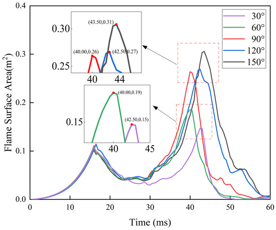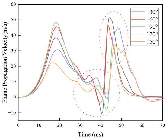 Figure 9 and Figure 10 show the variations in flame propagation speed and area of pipes bent at different angles. As can be observed in Figure 8, the oscillation change of flame propagation speed was almost the same under all working conditions. And there were three speed peaks during the propagation process. The flame development was divided into the early stage, the middle stage, and the late stage, which respectively correspond to the development of the three speed peaks. It is obvious that under different working conditions, the values of the three speed fronts all showed significant differences. This indicates that the continuous elbow structure had a significant impact on the development of the flame.