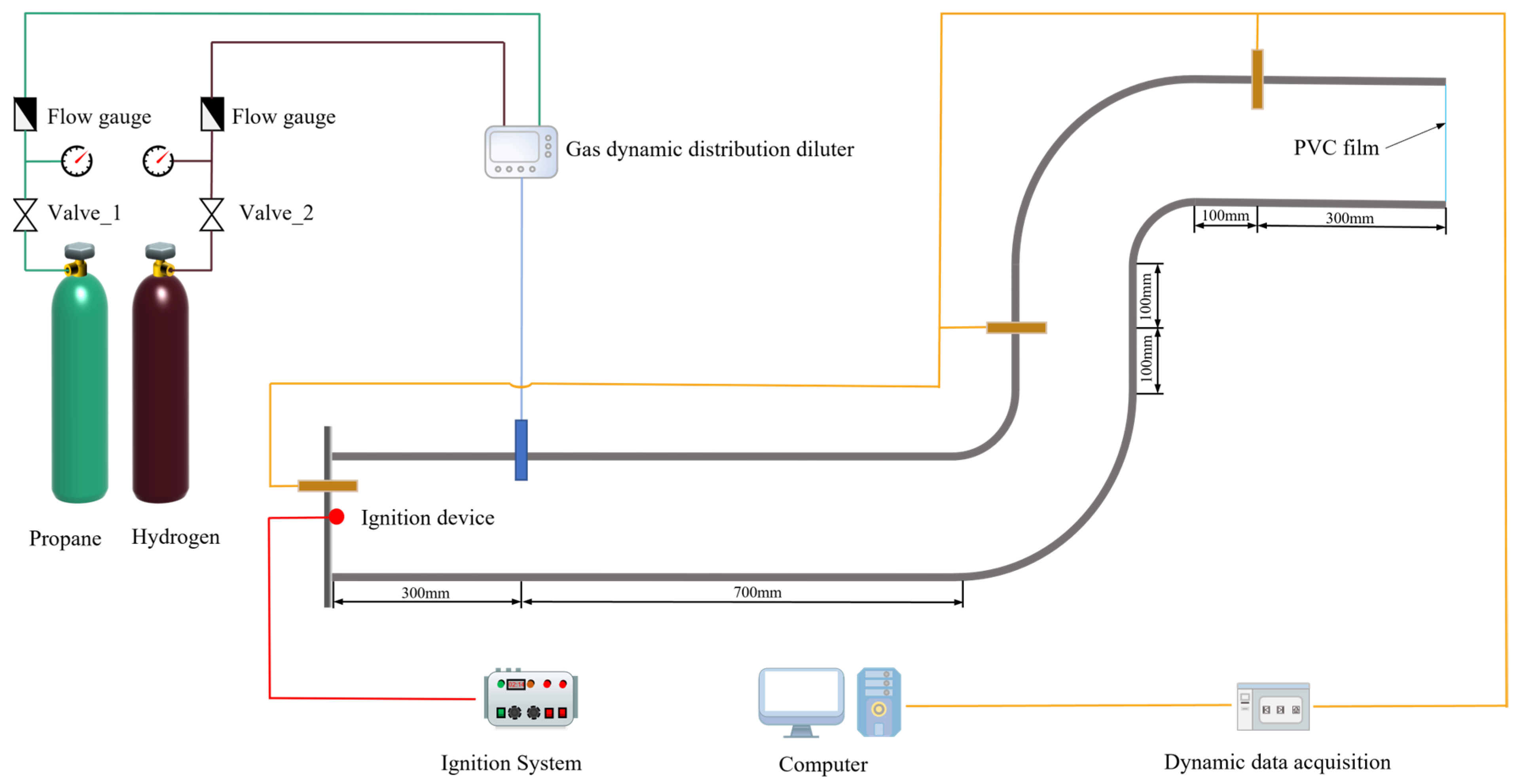 Wu, X.; Gao, J.; Hao, B.; Shao, X.; Yang, Y.; Li, M.; Han, Y.; Wu, Y. Research on the Explosion Characteristics of Hydrogen-Propane Based on the Angle of the “Z”-Shaped Pipe Elbow. Fire 2025, 8, 468. https://doi.org/10.3390/fire8120468