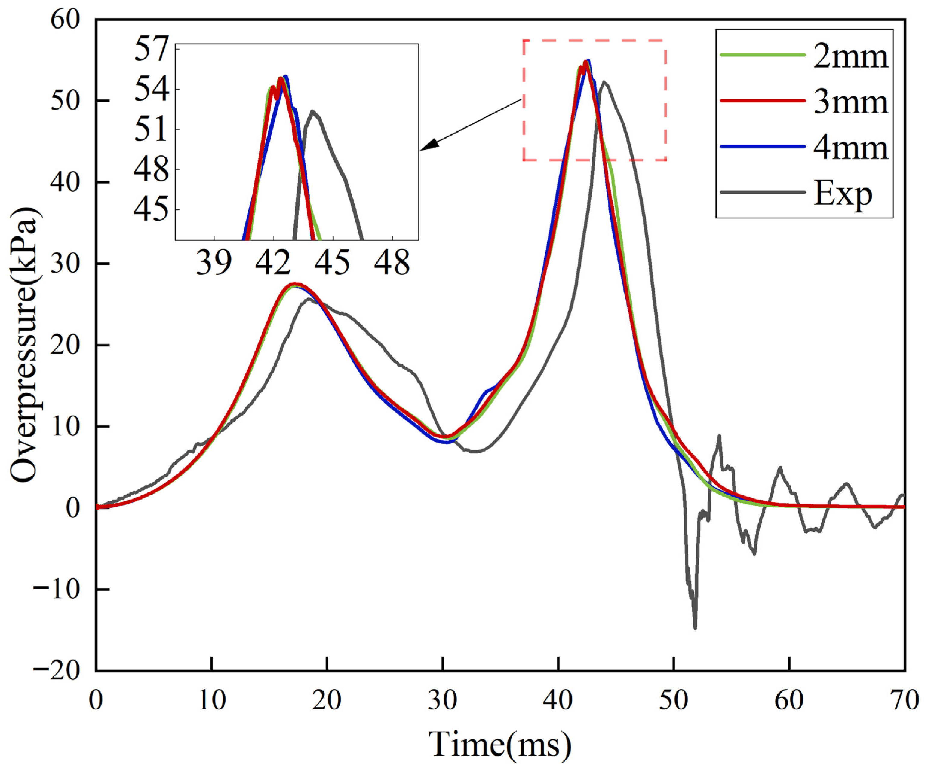 - Li, R.; Xiu, Z.; Liu, Z.; Liu, Q.; Li, M. Simulation of Obstacle Spacing Effects on Premixed Hydrogen-Air Explosion Dynamics in Semi-Confined Spaces. Int. J. Hydrogen Energy 2025, 105, 735–747. [Google Scholar] [CrossRef]