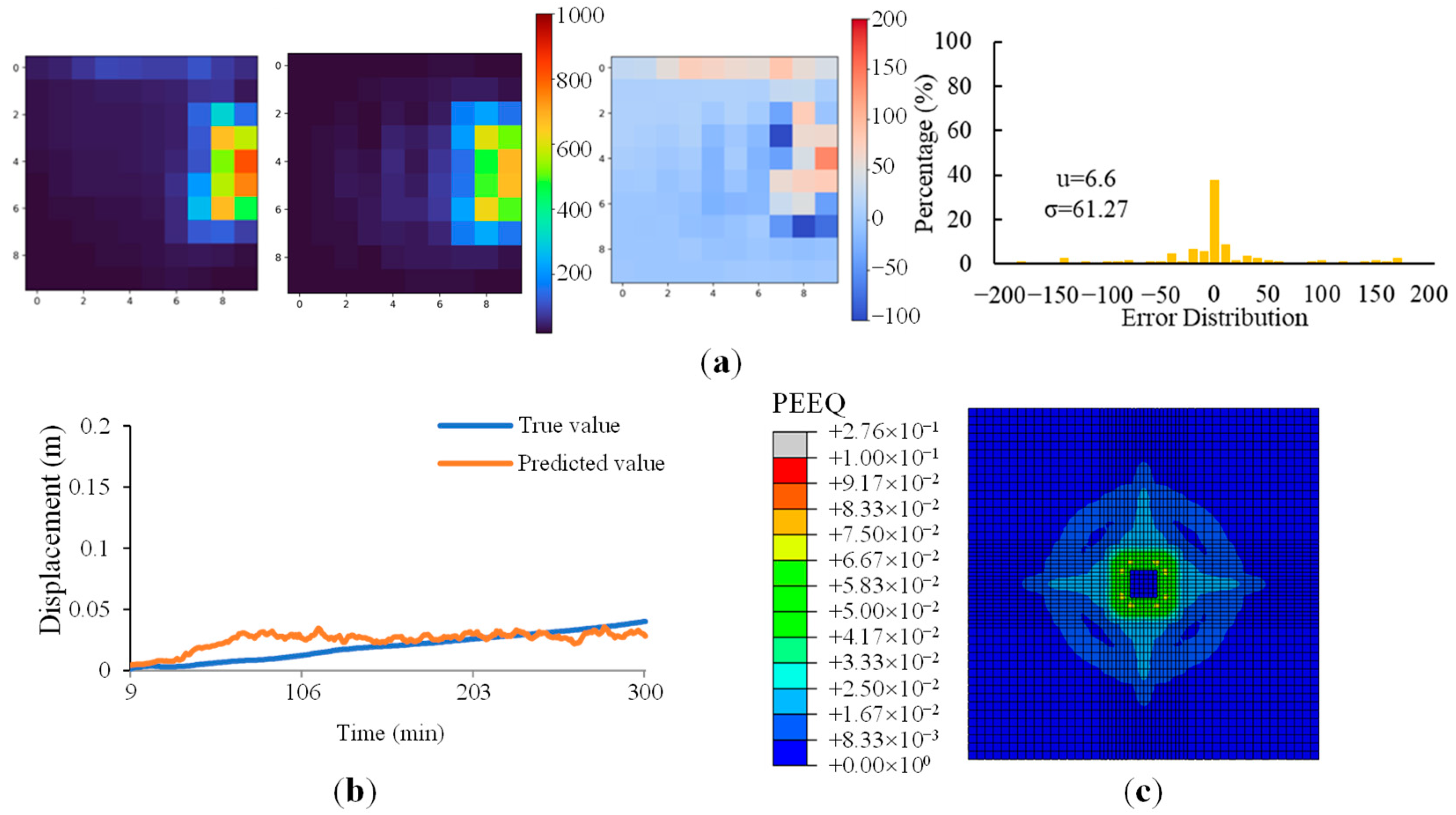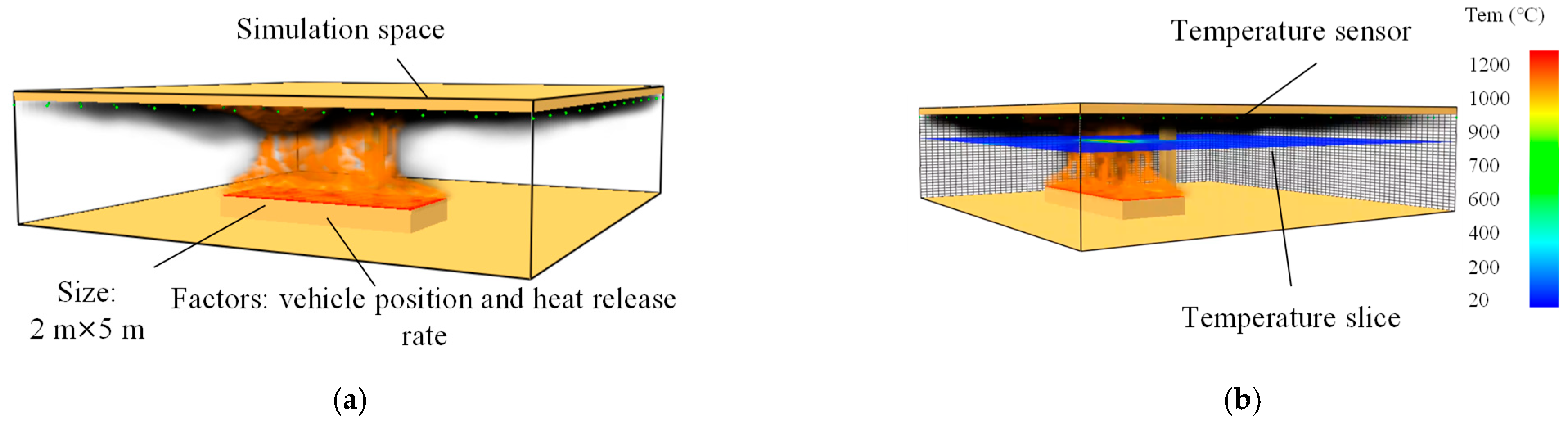 Figure 15, the average and standard deviation of the difference between the expected and simulated distributions were within 6.6 °C and 61.27 °C, respectively, which were comparable to those of the trained scenarios. The predicted deflections also closely align with the simulations. However, it should be acknowledged that a thorough analysis of the influence of boundary conditions and ventilation is required before the method is applied in practical firefighting.