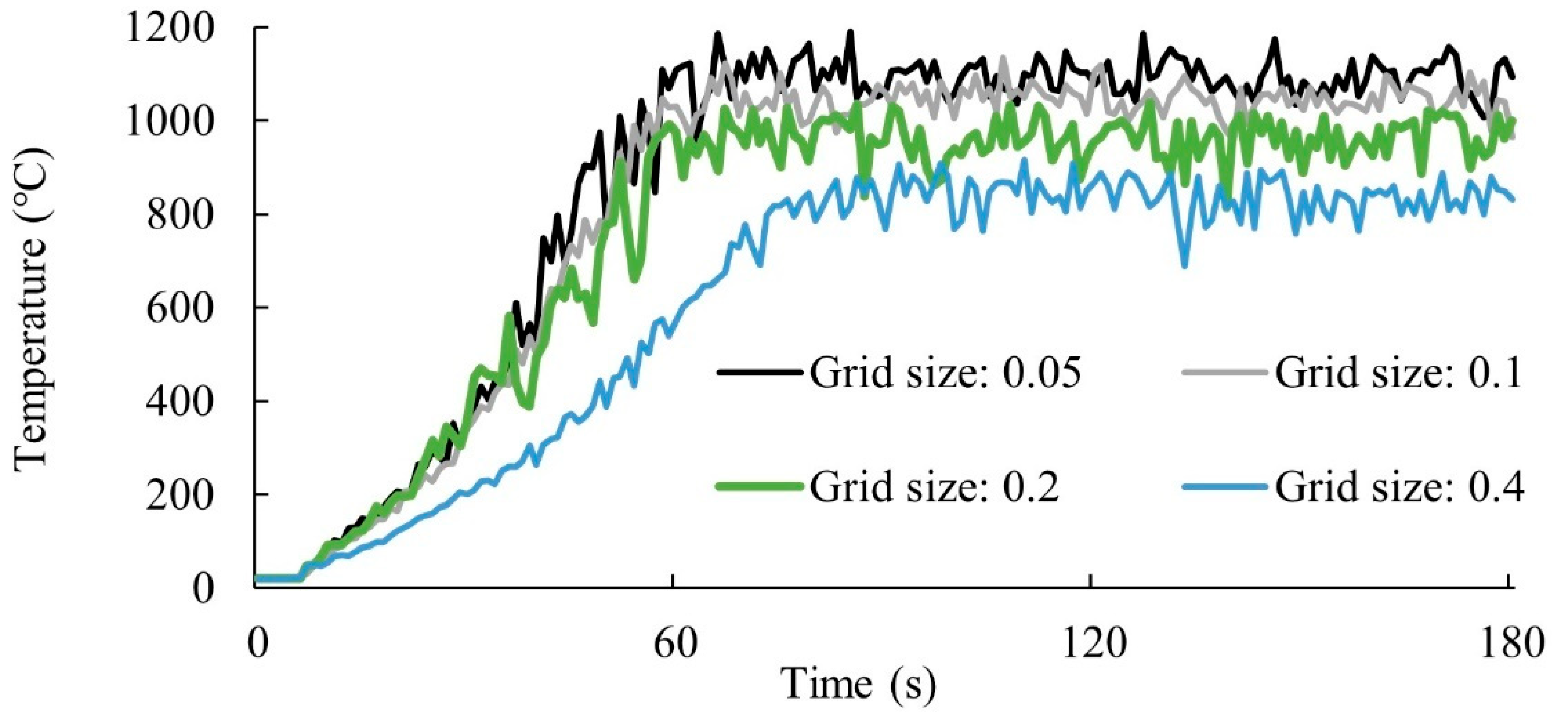 (c) Temperature distribution. The temperature distribution at a height of 2 m above the ground was recorded by the predefined slice during the 480 s fire simulation. The temporal variation in air temperature was captured at an interval of 1 s with the slice. The built-in programme “fds2ascii” available in FDS was adopted to export the slice data at a moment into a matrix with the dimension of 10 × 10. The recorded data of each scenario was cut into 292 matrices. The first and the last matrices were the temperature distribution recorded at times of 189 s and 480 s, respectively.