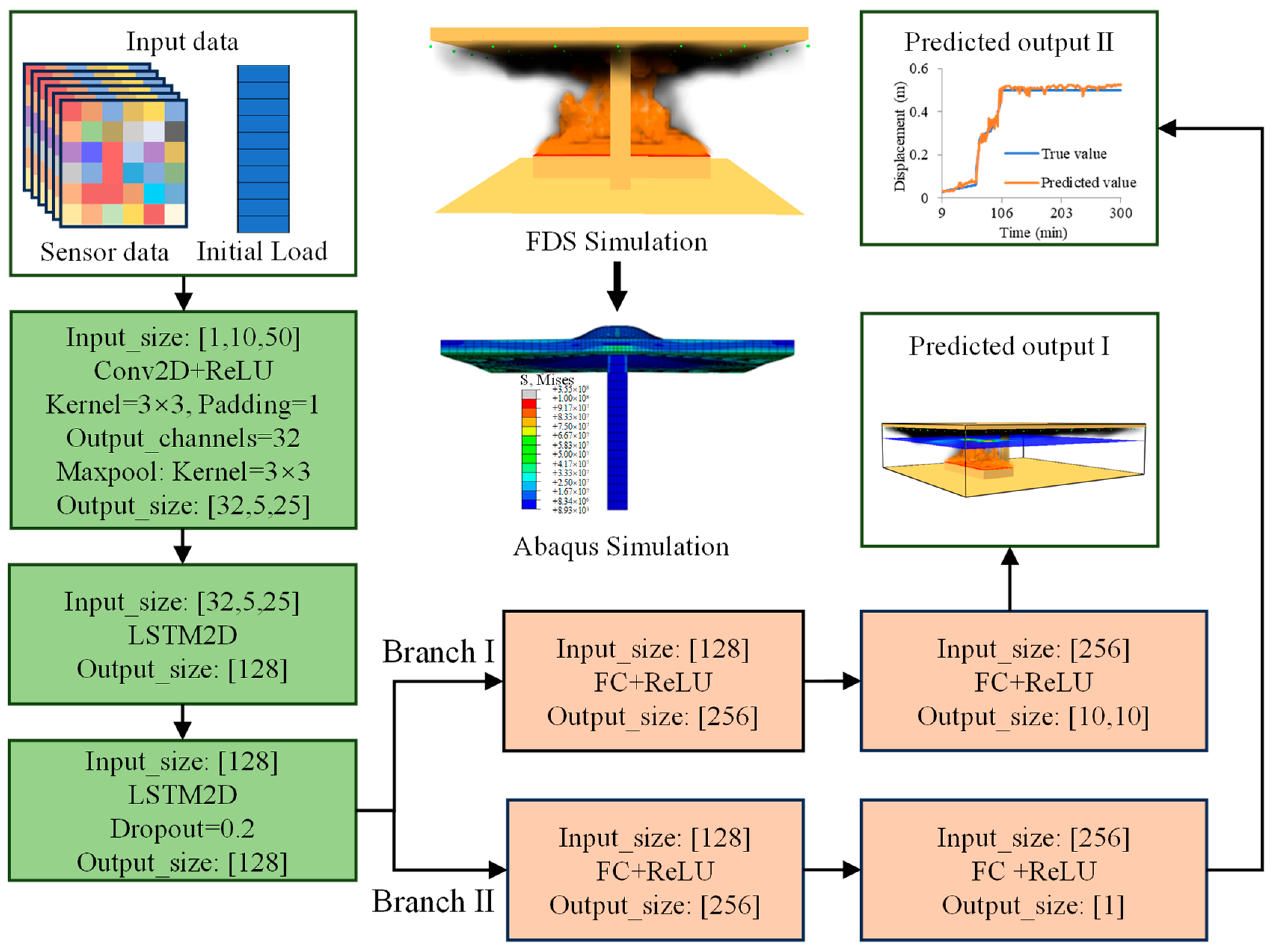 Figure 5) combining the CNN and LSTM models is proposed in this study to predict the temperature distribution and structural response under fire. The model consists of seven layers, including one CNN layer, two two-dimensional LSTM (2D-LSTM) layers, two fully connected layers for temperature output, and two fully connected layers for structural response prediction.