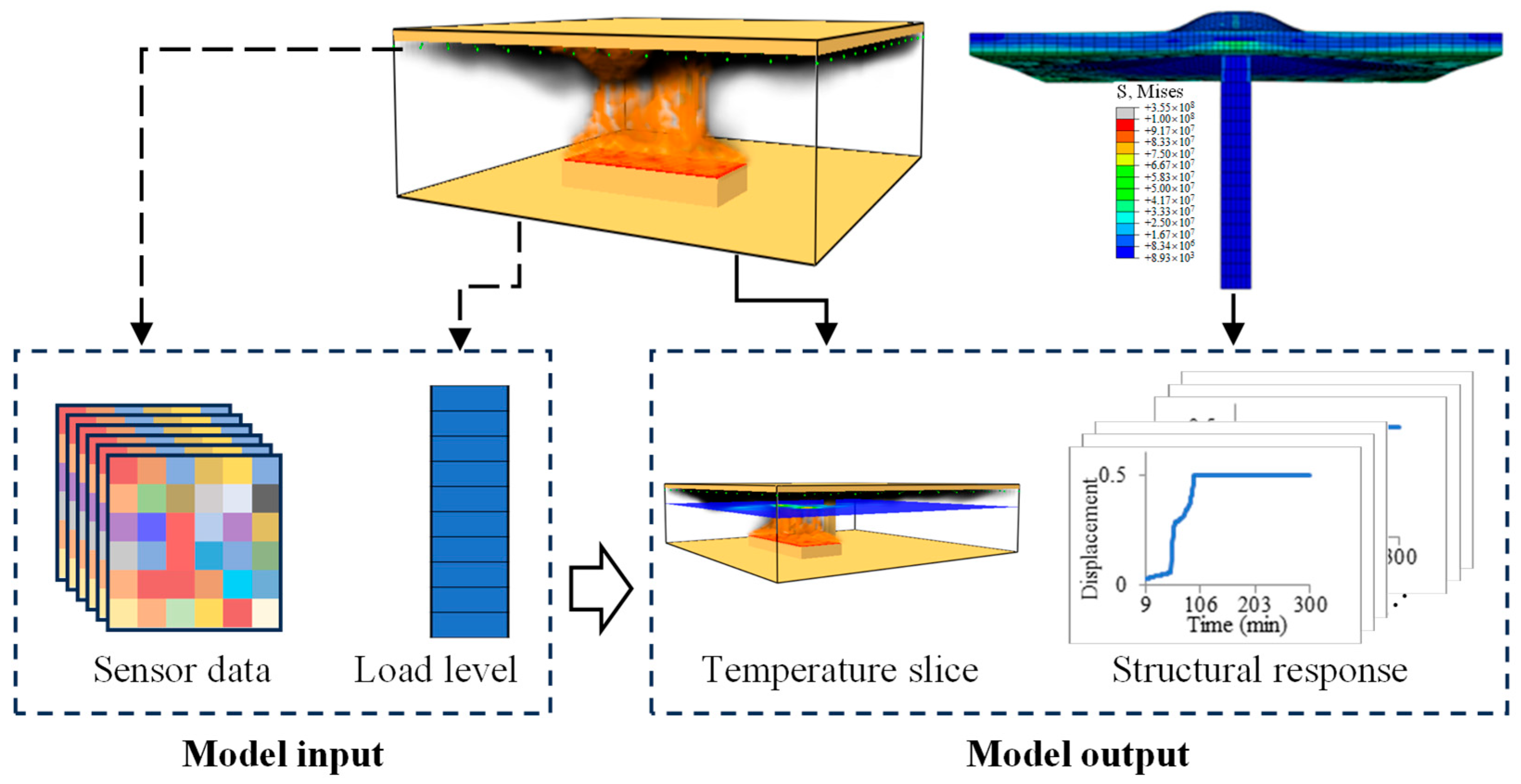 The proposed model for the prediction of temperature distribution and structural responses was trained with the datasets established with the simulation results, including sensor temperature history, gas temperature distribution evolving with time and displacement history at the slab edge. Specifically, the method of obtaining the data used to construct the training dataset was as follows: