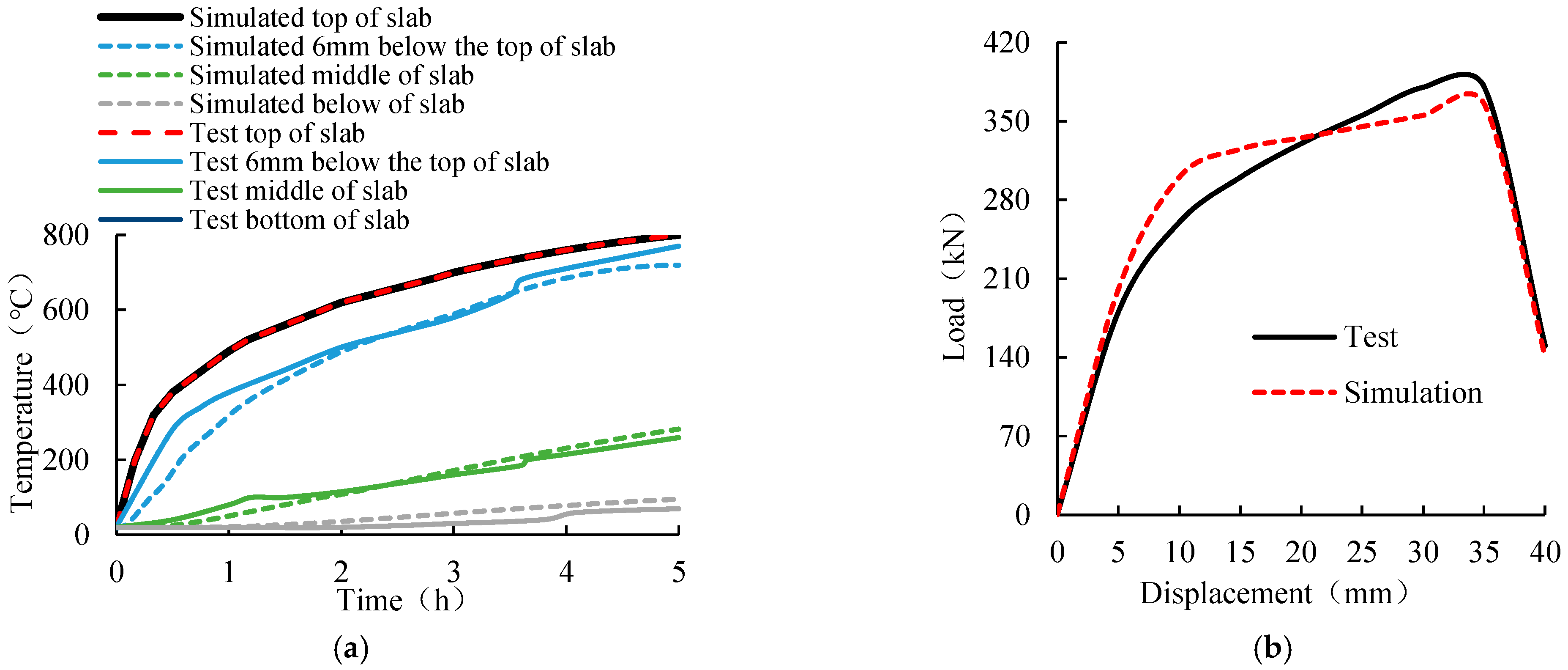 The FE model of the flat slab–column joint was validated with previous fire tests before it was applied to simulate the thermomechanical responses. During the tests [