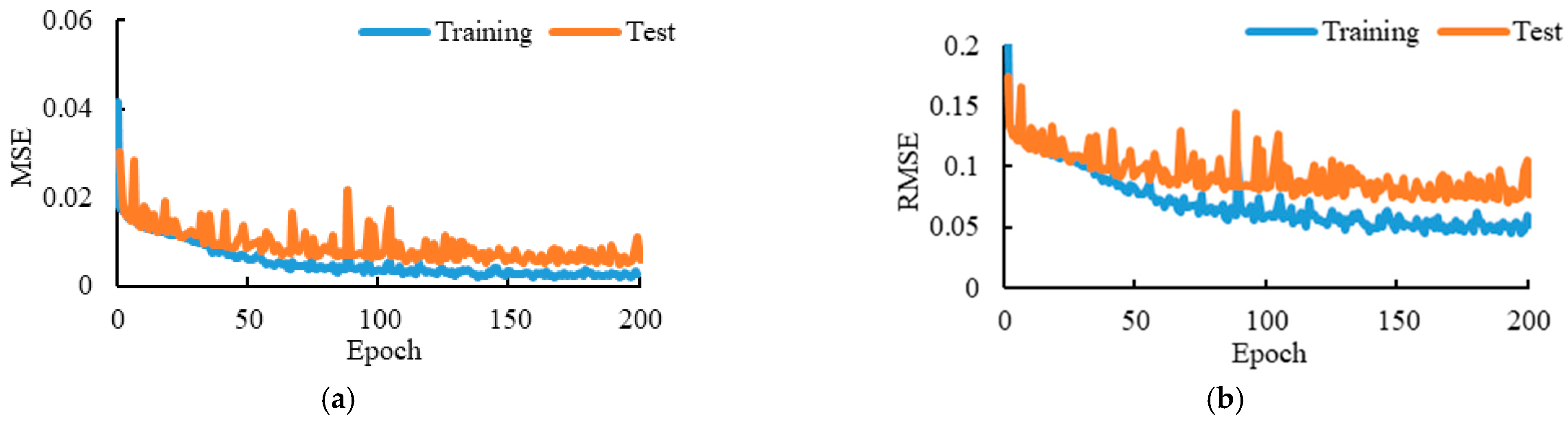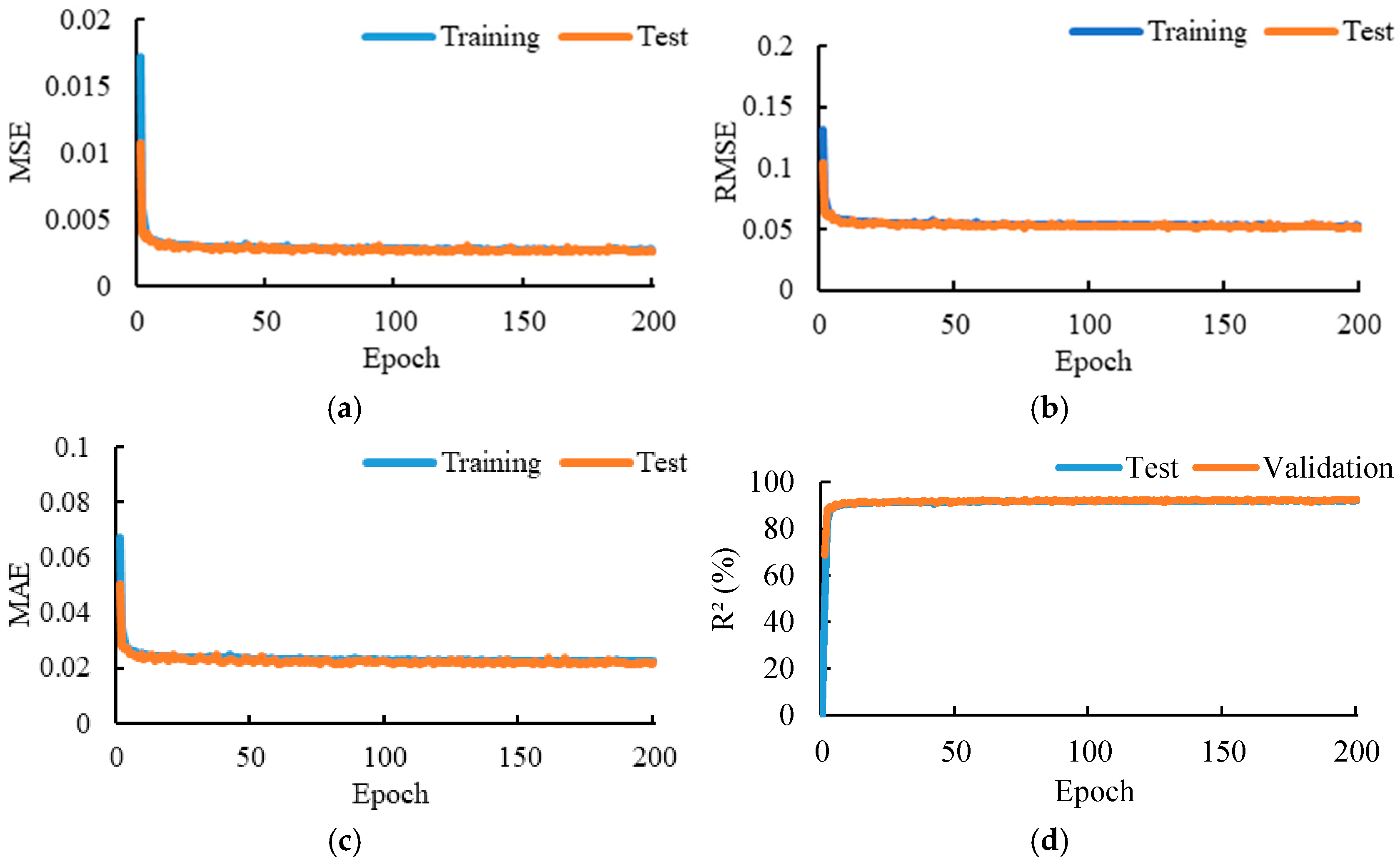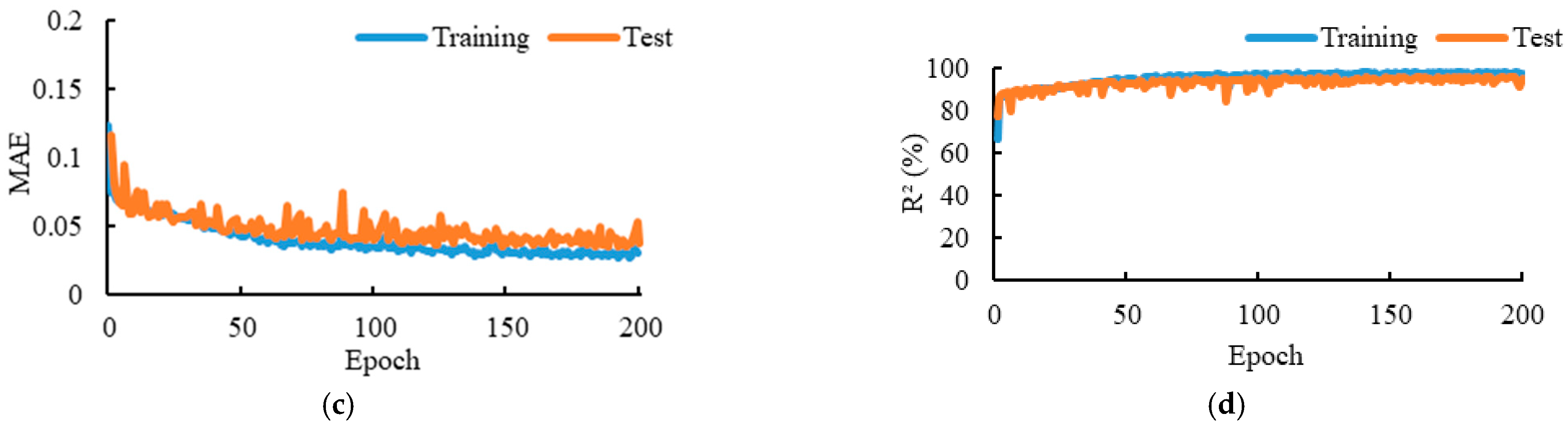 R2 value increased steadily until it reached 95%. Owing to the adoption of a dropout rate of 0.2 during training, the test curves were slightly higher than the training curves. This regularisation technique compelled the network to learn more robust features with reduced interneuron dependence and higher generalisation capability, while all neurons were activated during testing. The close overlap between the training and test curves indicates that no overfitting occurred. The