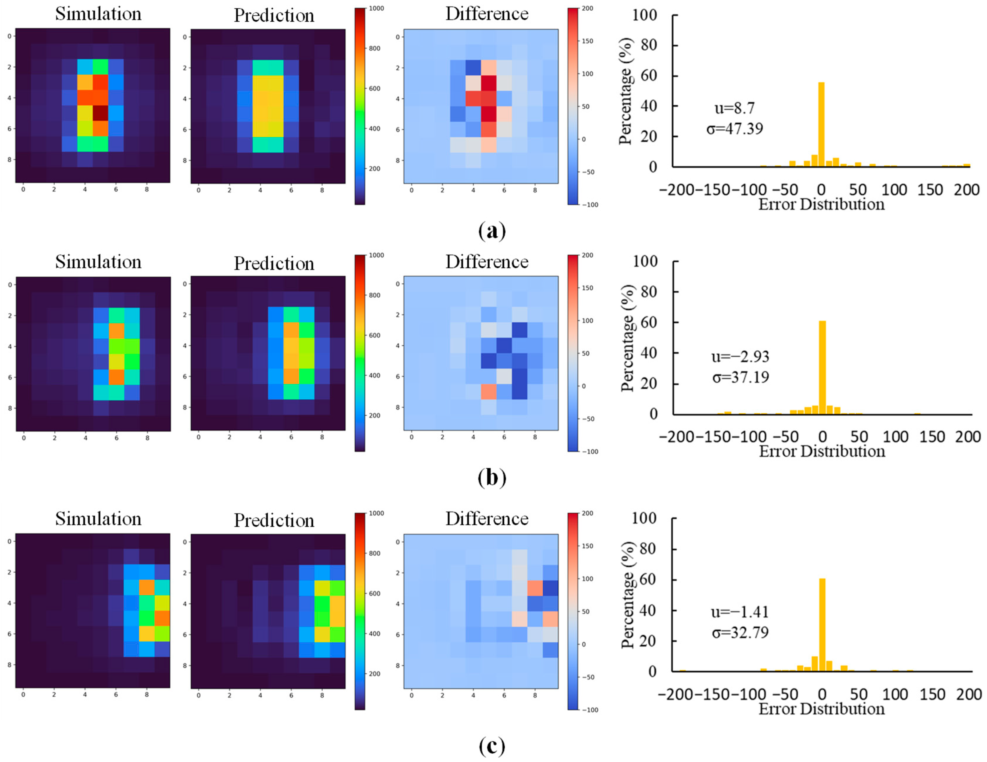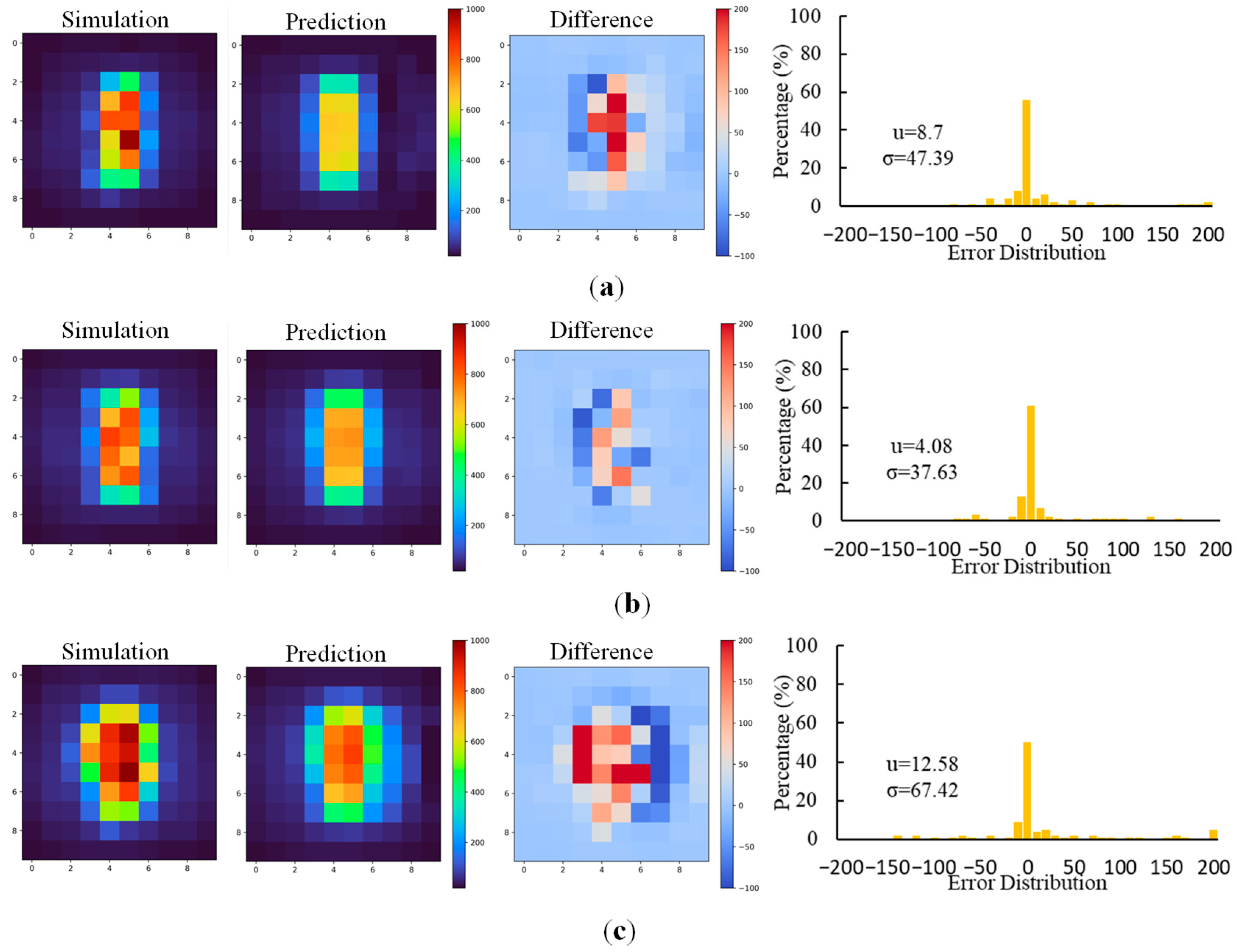 Figure 10. The subfigures from left to right were the simulated and predicted temperature distribution, the spatial variation in the temperature difference, and the statistical error distribution calculated with the temperature difference. The predicted and simulated temperature distributions coincided with each other. The average value and the standard deviation of the difference between the predicted and simulated distribution were roughly within 10 °C and 50 °C, respectively, which could be an acceptable deviation for practical firefighting. The location of the fire source can be easily identified from the predicted results shown in