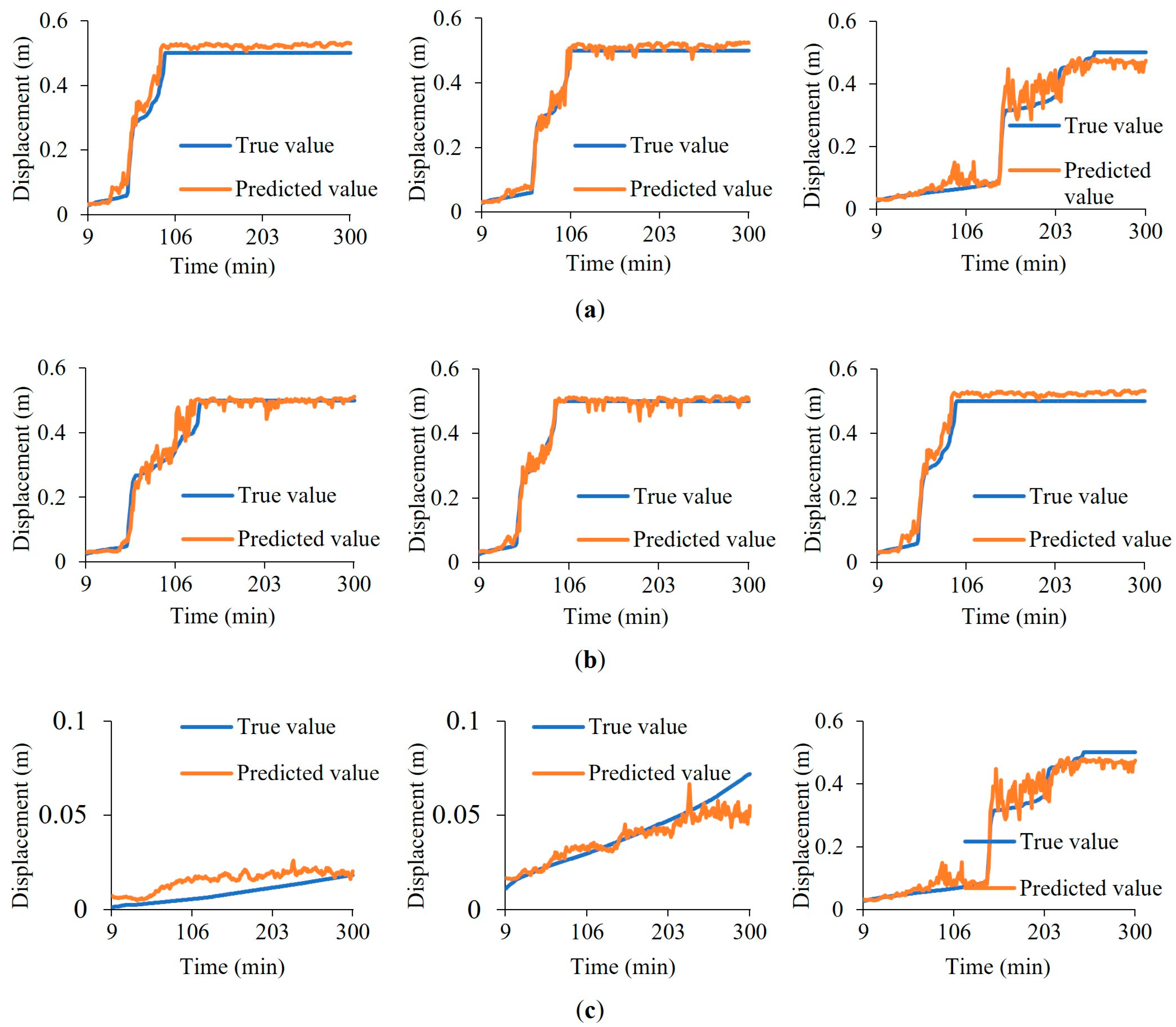 The simulation results show the evolution of the slab deflection experienced four stages, including a slow linear increasing stage, a sudden increasing stage, a nonlinear increasing stage, and a constant stage, where the structure collapses. The structures collapsed in a fire because the slab edge reached the deflection limit of 0.49 m rather than the rate of deflection 21.8 mm/min. The model performs well at the initial slow linear increasing stage, which may be due to the gentle, slow trend being easier to learn. The performance of the model at the nonlinear increasing stage and the constant stage was relatively unsatisfactory, with slight fluctuations.