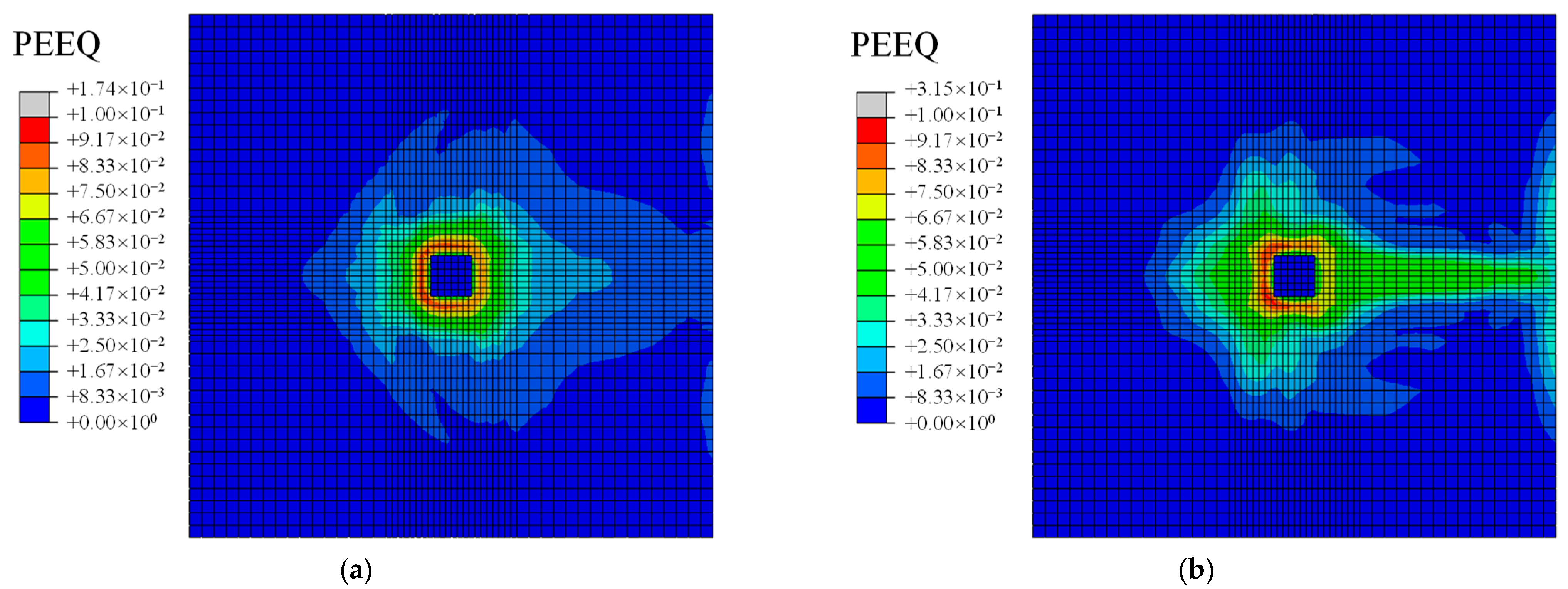 Figure 12c. The concrete at the slab–column joint area suddenly failed at around 140 min. The equivalent plastic strain pattern of the structure near the conjunction area shows that the cracks extending from the slab–column conjunction to the slab underwent a complete development and formation process within a relatively short time period, inducing a significant deflection at the slab edges as illustrated in