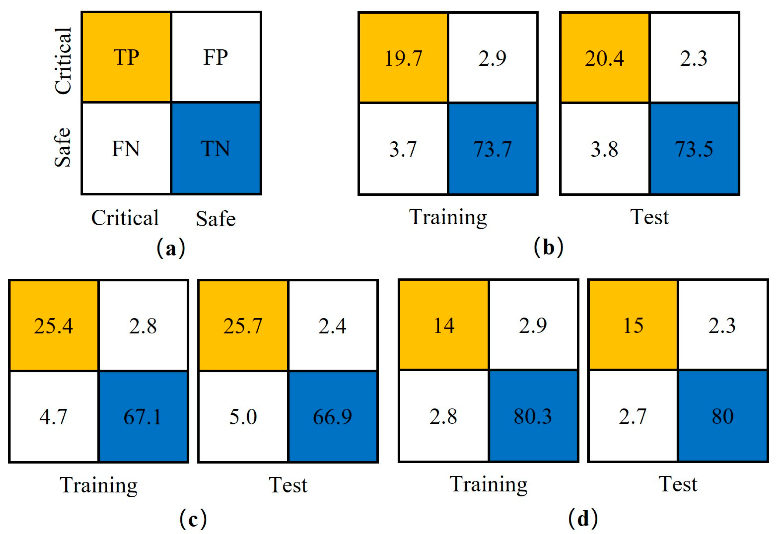 46] indicate that inhaling air temperatures exceeding 60 °C can cause mild burns to the respiratory tract, and if temperatures in areas below 2 m height exceed 60 °C, humans will find it intolerable. This value is adopted in the study as the safety limit. Most of the current studies focus on fire safety, ignoring the potential occurrence of structural collapse. In this study, both fire and structural safety were considered. Reaching an average value of the temperature distribution of 60 °C or an edge deflection limit of 0.49 m was classified as a dangerous state. The predicted results were calculated and classified into two states: safe or critical (dangerous). The confusion matrix was used to assess the model’s prediction performance. The values of true positive (TP), false positive (FP), false negative (FN), and true negative (TN) were calculated. Ideally, the data should be fully distributed along the diagonal, indicating a perfect match between the true and predicted values. As illustrated in