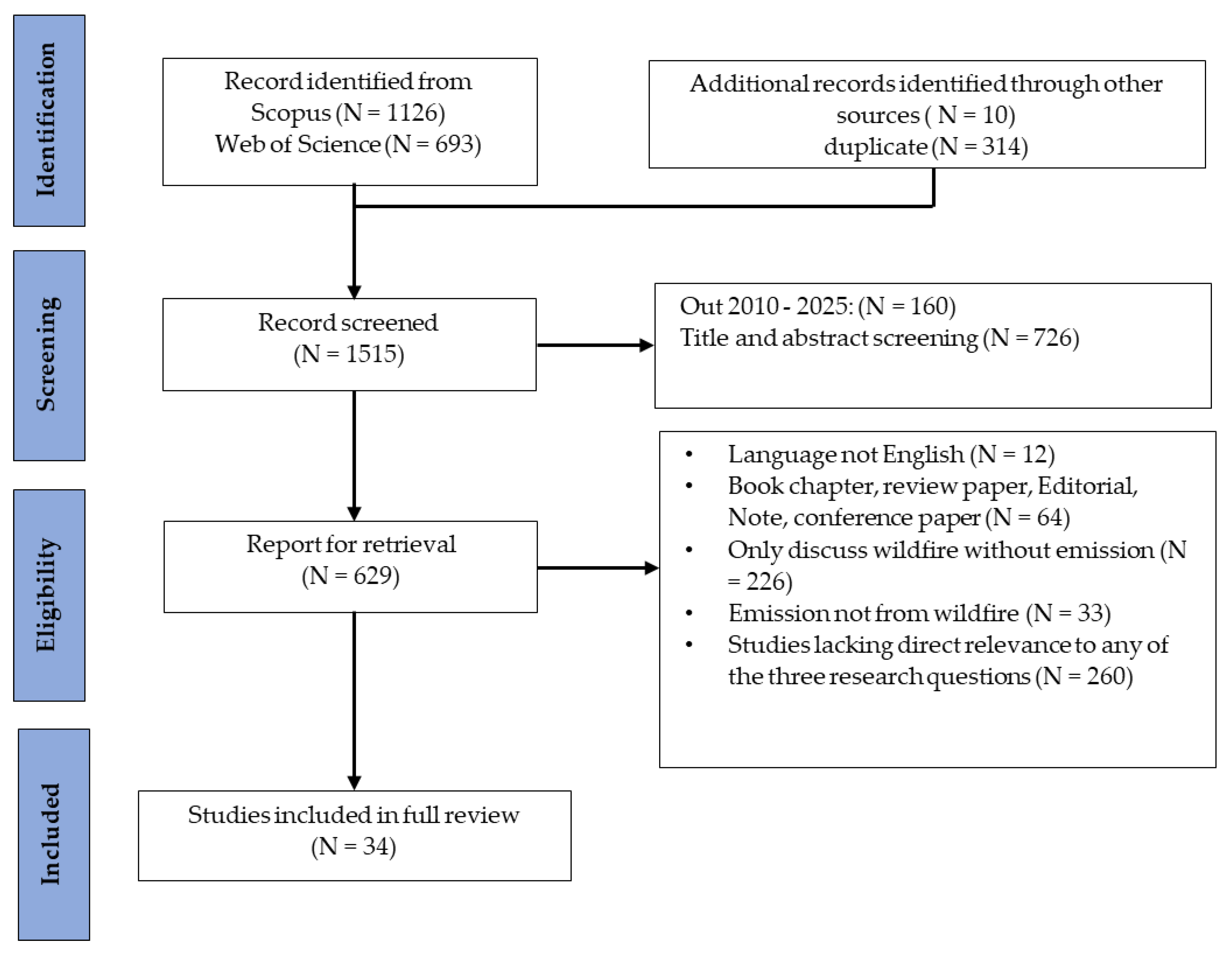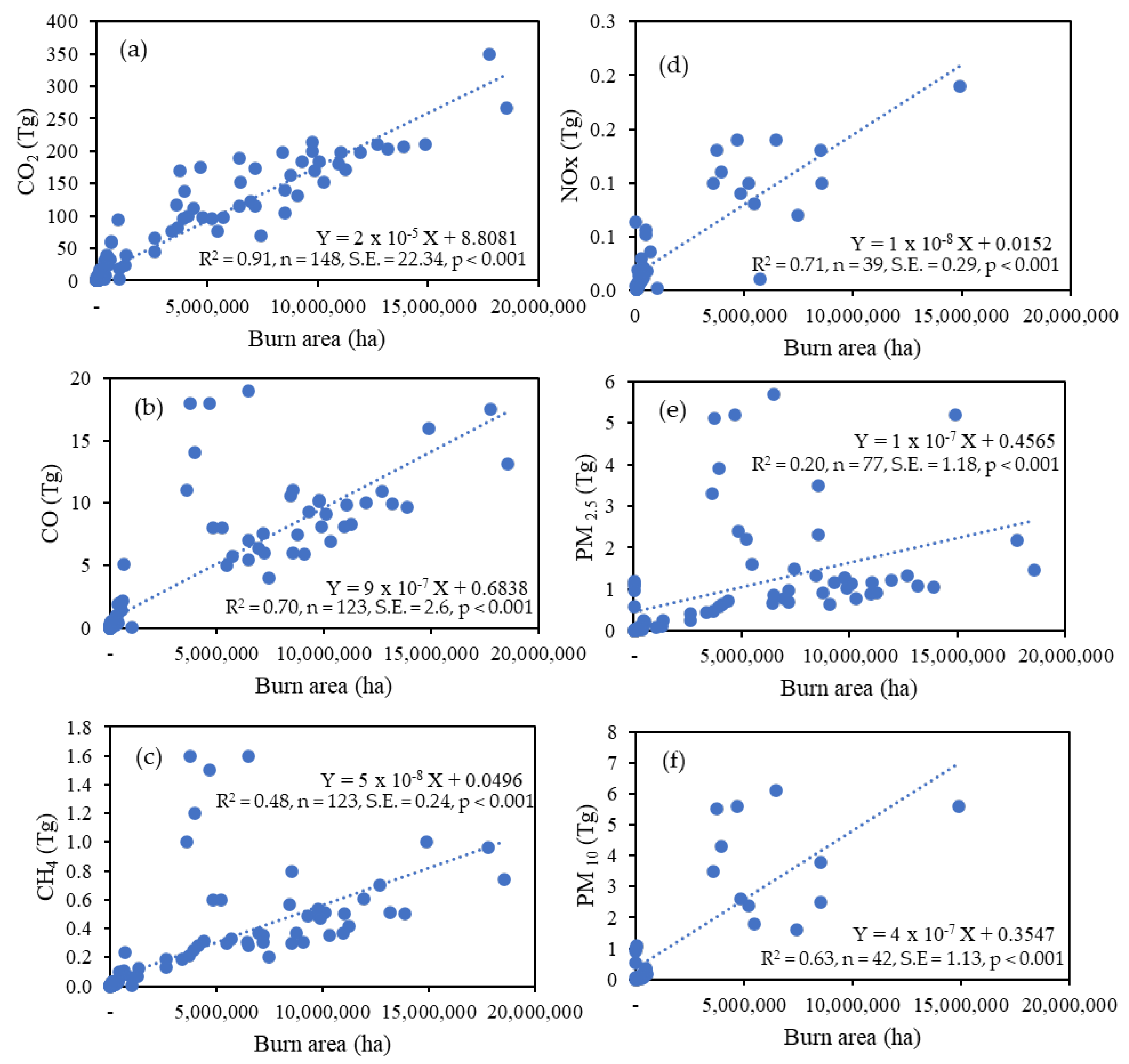 - Despite notable advances, methodological inconsistencies remain a key limitation across studies. Disparities in emission factor selection, satellite detection capability, and ecosystem representation contribute to significant uncertainty in global emission inventories. Cross-ecosystem analyses, particularly involving peat, tropical, and boreal fires, remain underrepresented. To address these gaps, future research should prioritize harmonization of emission measurement techniques, the integration of high-resolution remote sensing with in situ validation, and the expansion of standardized emission factor databases across biomes.