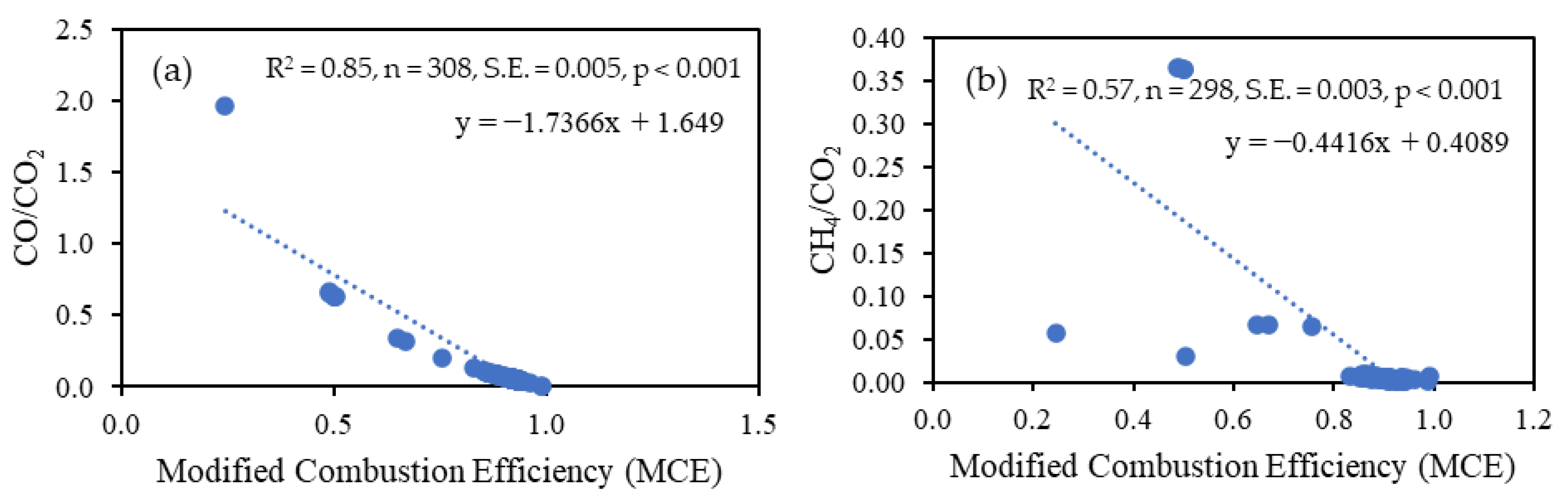 - The findings demonstrate that carbon dioxide (CO2) dominates total fire-related emissions and shows strong predictive correlations with carbon monoxide (CO) and methane (CH4), highlighting their interdependence under varying combustion regimes. The Modified Combustion Efficiency (MCE) is identified as a key determinant of emission composition, with higher MCE values yielding complete combustion and higher CO2 outputs, whereas lower MCE values increase incomplete combustion products such as CO, CH4, and particulate matter (PM2.5 and PM10).