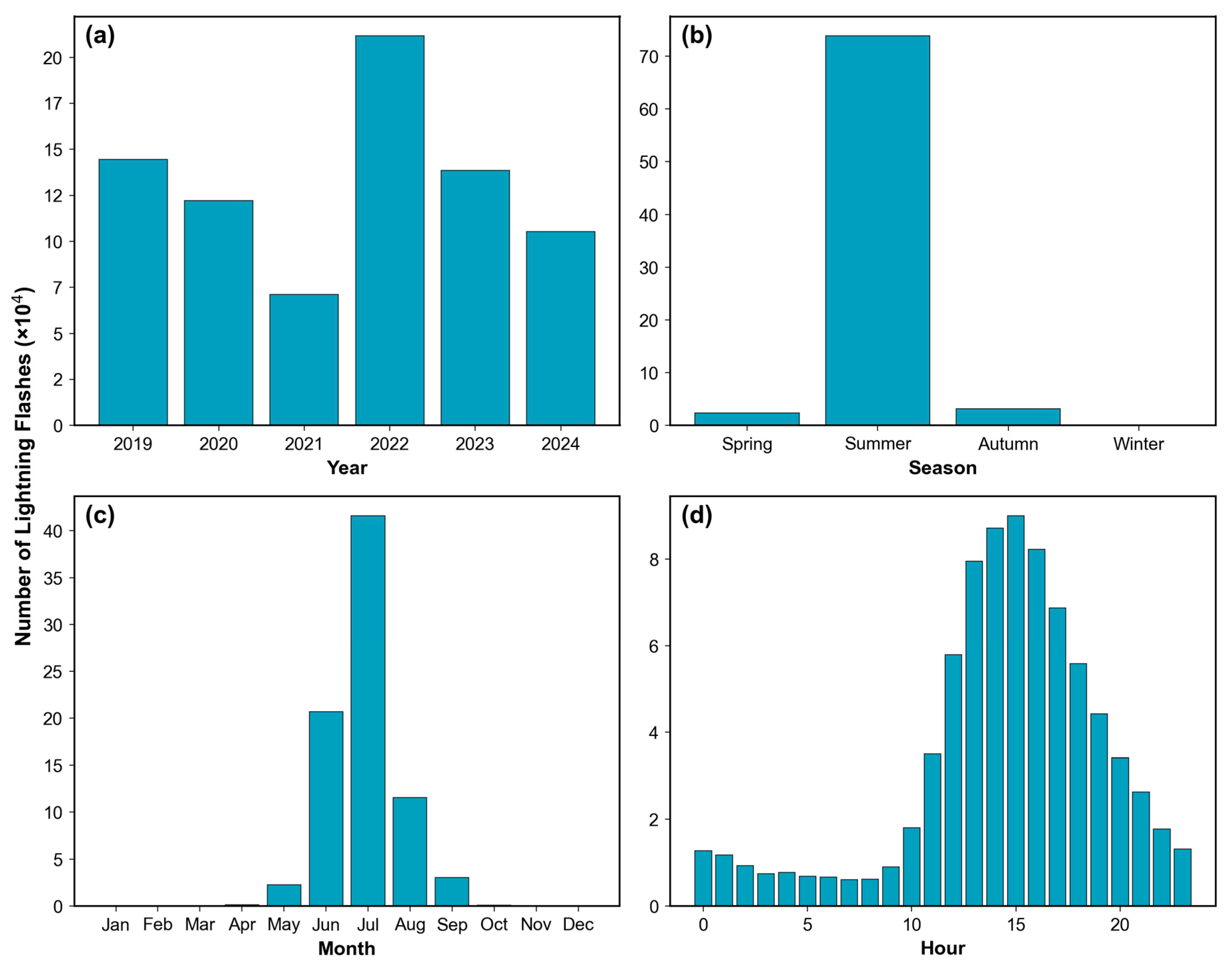 - Zhao, Y.; Yan, J.; Tuo, Y.; Kong, X.; Bi, L. Analysis of the Relationship between the Spatiotemporal Distribution of Land Lightning and Atmospheric Environmental Factors in China. Chin. J. Atmos. Sci. 2025, 49, 313–324. [Google Scholar]