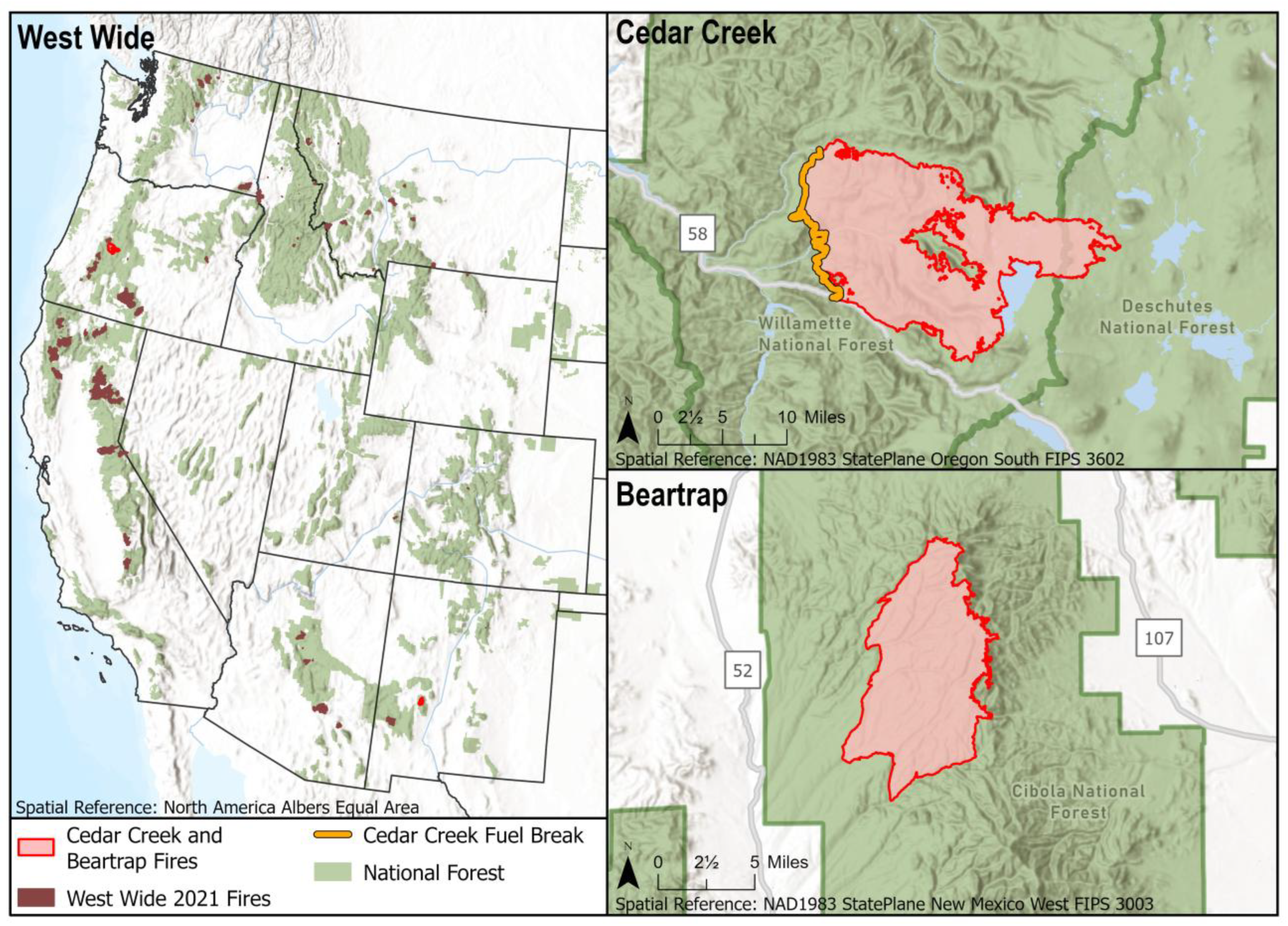 Figure 1. West wide map of fires represented in 2021 survey (dark red) and 2022 case studies (red). Cedar Creek fire and Bear Trap fire insets (right, top, and bottom panel, respectively).
