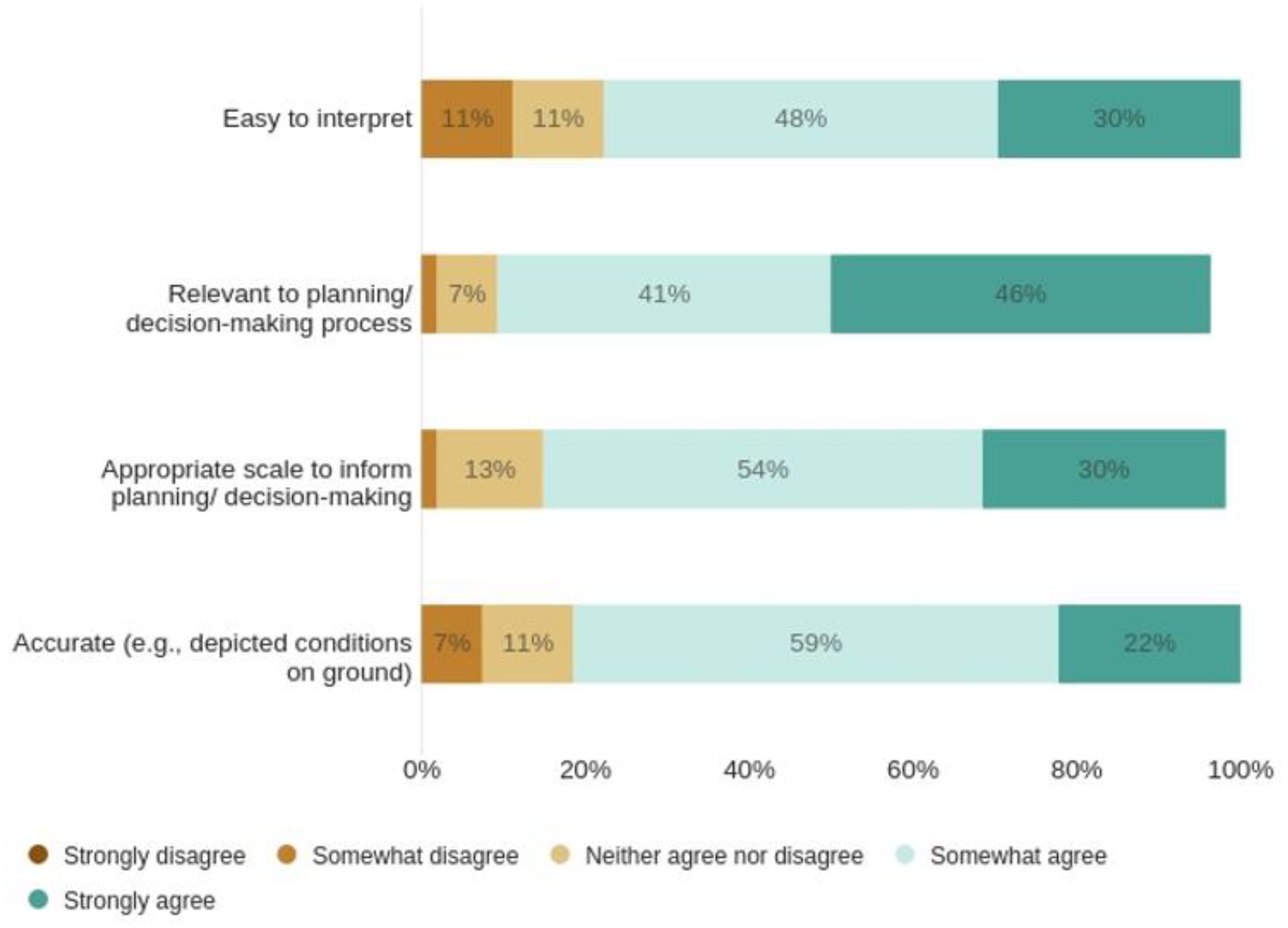 Figure 2. Percent of survey respondents who agreed or disagreed that Risk Management Assistance (RMA) tools were easy to interpret, relevant, at the appropriate scale, and accurate.