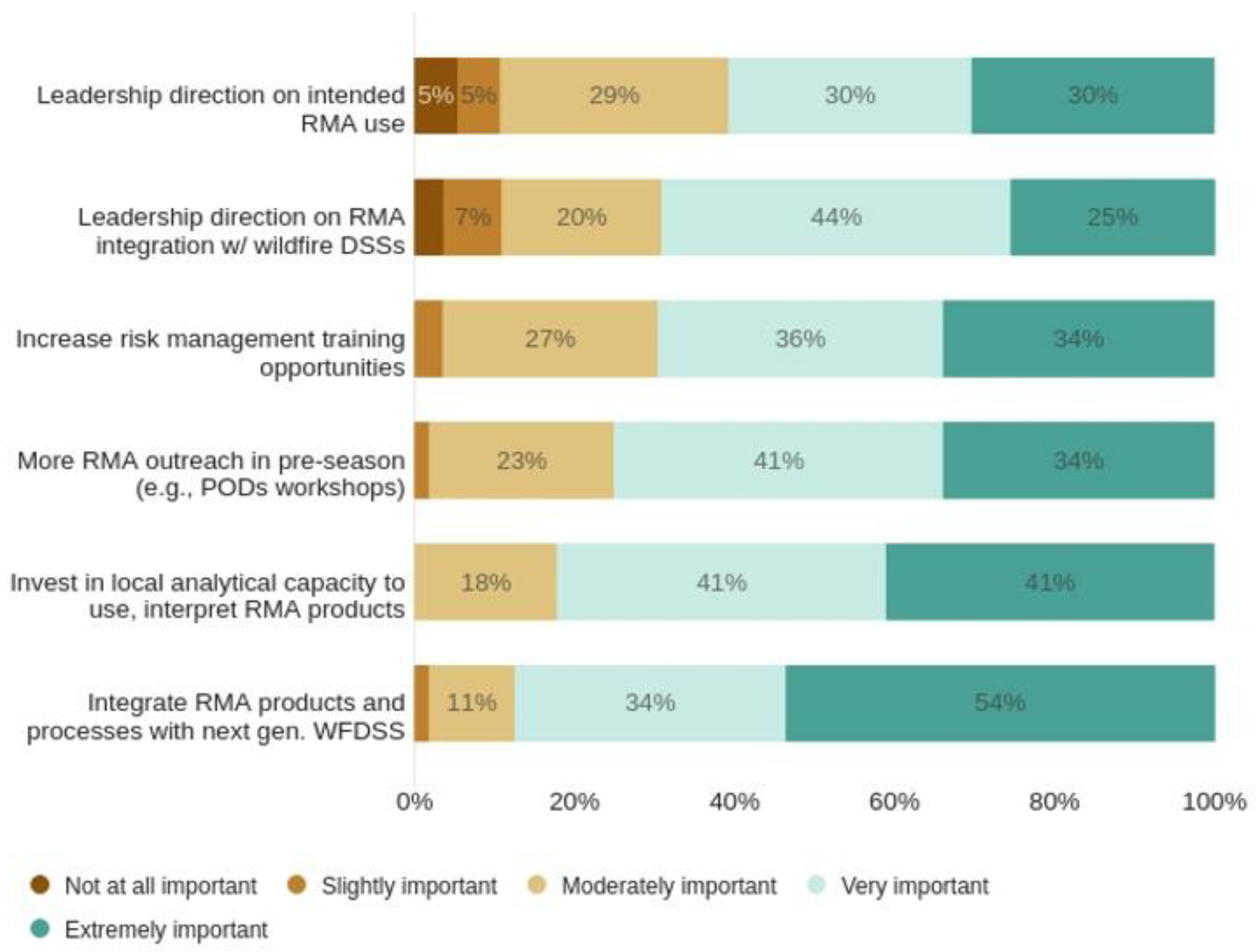Figure 4. Percent of survey respondents who felt six common recommendations to improve Risk Management Assistance (RMA) identified by previous research were not-at-all to extremely important [24,25]. Abbreviations: DSS—decision support systems; PODs—Potential Operational Delineations; and WFDSS—Wildland Fire Decision Support System.