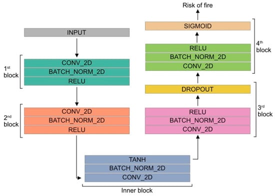 The architecture comprises several sequential blocks, each integrating convolutional layers, batch normalization, and activation functions to progressively refine the feature representation. As depicted in Figure 5, the CNN architecture utilized in this study consists of four main blocks. The filter counts for each block were set to 40, 60, 30, and 1, respectively, to adjust the network’s capacity for learning different levels of features. This arrangement was chosen to gradually increase the number of feature maps, enabling the model to capture more complex patterns related to wildfire occurrences. For activation functions, the architecture used the hyperbolic tangent (tanh) function in the inner blocks to maintain the range of the output while allowing negative values, which can help in capturing intricate details. The remaining blocks employed the Rectified Linear Unit (ReLU) activation function, known for its efficiency in deep learning tasks due to reduced likelihood of vanishing gradients. The final layer used a sigmoid activation function to transform the outputs into a single filter, representing the probability of each pixel belonging to the fire risk class. The overall CNN model encompasses 587,177 trainable parameters. This parameter count was selected to achieve a balance between model complexity and computational efficiency, making the architecture suitable for real-time wildfire detection tasks while maintaining a high level of accuracy.