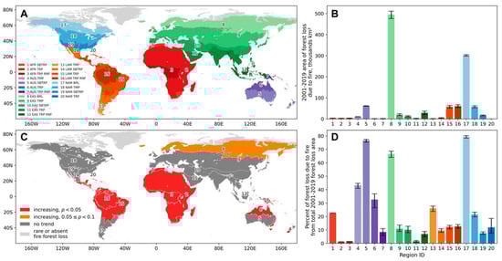 Utilizing Google Earth Engine (GEE), a diverse set of images has been extracted from various regions worldwide from 2018 to 2020. The study emphasized fire seasons in Africa, Asia, Australia, Europe, South America, and the United States (Figure 2) with broad geographical and historical coverage, while accounting for considerations related to missing data. In this study, 20 remote sensing data sources were explored, aiming for a comprehensive representation. Table 2 presents details on the spatial and temporal resolution of these features. Figure 2 below illustrates global patterns and trends in forest loss and associated dynamics across different regions from 2000 to 2020.