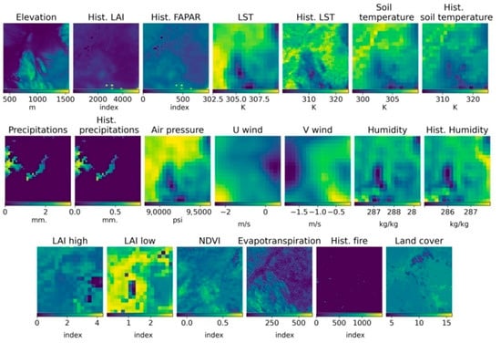 Figure 3 and Table 2 provide a comprehensive visualization of environmental variables derived from remote sensing and meteorological data, including topographical parameters (elevation), vegetation indices (LAI, FAPAR, NDVI), climatic factors (land surface temperature, humidity, precipitation, wind components, and air pressure), and soil properties (soil temperature). The figure also includes histograms for variables such as LAI, FAPAR, land surface temperature, soil temperature, precipitation, and humidity, offering statistical insights into their distributions. Additionally, evapotranspiration, fire occurrences, and land cover classifications are represented, highlighting the diversity of datasets used for environmental modeling and analysis. These datasets are critical for studying land-atmosphere interactions, ecological dynamics, and disaster monitoring.