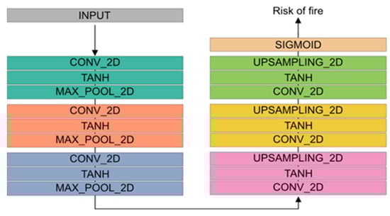 The initial architecture for assessing wildfire risk is an autoencoder. The autoencoder comprises six essential blocks, with the initial three being convolutional layers that logically decrease the number of channels, really compacting the picture. The subsequent three layers then increase the number of filters, expanding the image. The filter counts for each respective convolutional layer are 40, 20, 5, 5, 20, and 40. All max-pooling and upsampling layers employed a 2 by 2-pixel kernel. The activation function used across all layers was tanh, except for the final layer, which employed a sigmoid activation function to convert the outputs of preceding layers into a single filter. The entire model encompassed 36,596 parameters. Figure 4 illustrates the architecture of the autoencoder designed to predict fire risk. The model begins with an input layer, followed by three successive blocks of convolutional layers (CONV_2D), activation functions (TANH), and pooling layers (MAX_POOL_2D) to extract and compress spatial features. The compressed representation is then passed through symmetric decoding layers comprising upsampling layers (UPSAMPLING_2D), activation functions (TANH), and convolutional layers (CONV_2D) to reconstruct the data. Finally, a sigmoid activation function in the output layer maps the decoded features to a fire risk probability. This structure demonstrates the use of autoencoders for feature extraction, dimensionality reduction, and reconstruction, tailored for fire risk prediction.