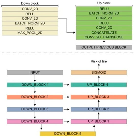 The U-Net architecture, which was also tested in this study, is designed specifically for image segmentation tasks. It uses an encoder–decoder structure where convolutional layers in the encoder path reduce the spatial dimensions while increasing the number of channels. The U-Net maintained the original image size by utilizing convolutional layers with padding, allowing for the retention of spatial information throughout the network. In the decoder path, the network expands the spatial dimensions while reducing the number of channels, enabling the reconstruction of a segmented output that matches the input size. This process facilitates the precise localization of fire risk areas in the satellite images. The comparison between the CNN and U-Net models revealed that while both architectures performed well in segmenting wildfire regions, the CNN architecture demonstrated superior performance with fewer parameters, making it more suitable for real-time applications.