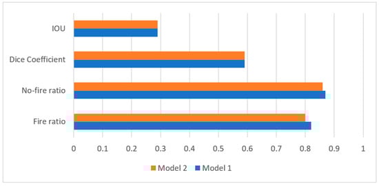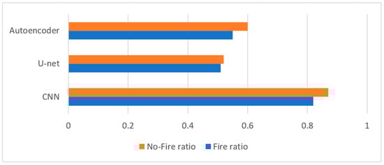 Table 4 compares the three deep learning models used in this study, highlighting their strengths and limitations. The CNN outperformed the U-Net and autoencoder, achieving a fire ratio score of 0.82 and a no-fire ratio score of 0.87. This performance advantage can be attributed to the CNN’s ability to capture more intricate spatial features due to its higher number of parameters (16 times more than the autoencoder). Incorporating dropout and batch normalization layers into the CNN further enhanced its regularization capabilities, contributing to its superior performance.
