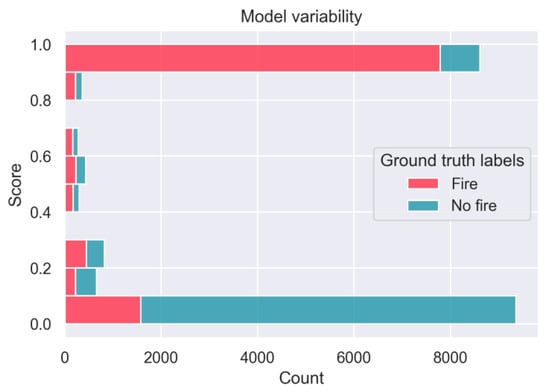 As shown in Figure 10, roughly 20% of the fire examples anticipated by the model were mislabeled, and a comparative circumstance was noticed for the no-fire cases. The bar plot shows that examples are predominantly distributed between the extremes, with fewer cases in the center. This insight provides a quantitative understanding of the model’s performance, highlighting areas where misclassifications occur and indicating the distribution of prediction errors across different classes.