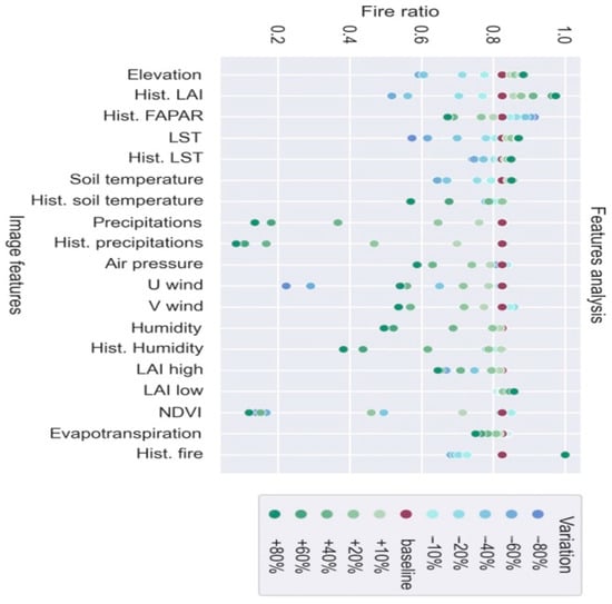 The results (Figure 13) for the fire ratio metric showcase how alterations to the input features impact the model’s predictions. This analysis provides valuable insights into the model’s sensitivity to changes in input features and highlights the potential variability in predictions under different conditions.