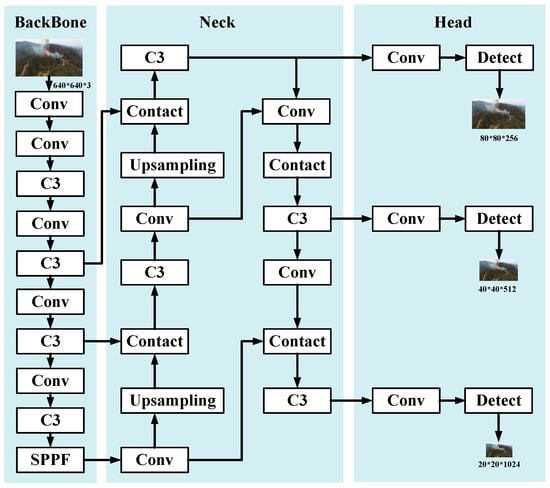 Schematic of the network architecture of YOLOv5, including the backbone network, neck network and head network.