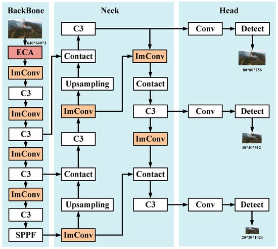 Schematic of the network architecture of improved YOLOv5. The pink box represents the newly incorporated ECA module in the model, while the yellow boxes indicate the substitution of the standard convolution module with the improved version.
