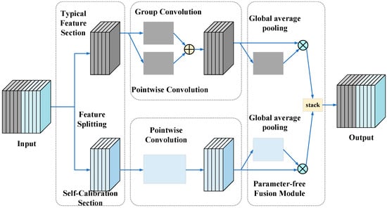 The usual channels undergo separate convolution processes in two parallel portions, one representing a main feature class (e.g., color or texture) to avoid potential repetition in the typical feature part. In order to cut down on redundant data, one operation uses group convolution on the channel with common characteristics; to make up for some lost information, the other process runs in parallel and uses 1 × 1 pointwise convolution. Since both convolution procedures are applied to the same channel, the result is determined by adding them together. The group convolution can be expressed as a diagonal matrix, so the typicality part of Equation (1) can be written as the follows: