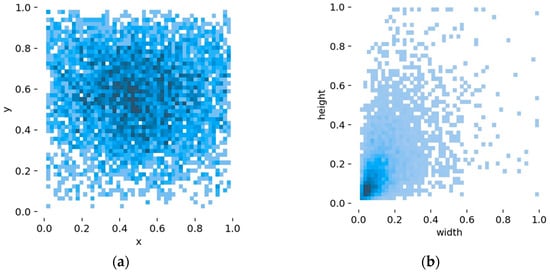 Figure 5 presents the analysis of the spatial locations and size distribution of fire areas across different images in the dataset. This analysis helps to visualize and understand the dataset’s diversity in terms of fire locations and sizes, which is essential for evaluating the model’s generalization capability. Figure 5a illustrates the spatial distribution of the fire, revealing a relatively non-uniform target distribution with a concentration of fire in the central region. In Figure 5b, an analysis of the size distribution indicates that most instances of fire occupy less than 20% of the width and height dimensions of the original image. This observation suggests that the majority of fires captured in the image are at an early stage, occupying only a small portion of its total area.