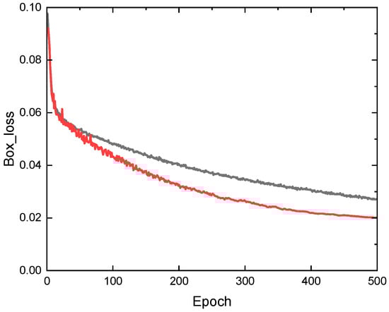 Comparison of the curve of bounding box loss value with the number of iterations before (black line) and after improvement (red line).