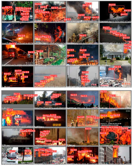 Table 1 demonstrates that the precision of the improved YOLOv5s model attains 91.22%, while the recall reaches 93.78%. The F1 value and mAP also reach 0.93 and 95.57%, respectively, all of which exhibit improvements compared to the original YOLOv5s model, placing it in a leading position among other algorithms. As shown in Figure 7, through detection visualization display, it is evident that the improved YOLOv5s model can accurately detect obscured and overlapping targets with high identification accuracy for fire.