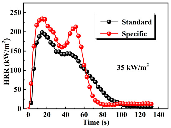 The HRR curves of RPUF along the time under standard and the self−designed specimen holders under heat flux of 35 kW/m2 [28].