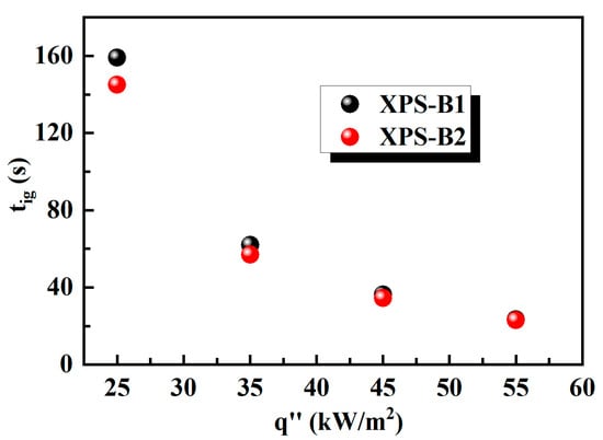 The ignition characteristics of the material were derived using the method proposed by Janssens [37], which involves plotting the incident heat flux against the reciprocal of the ignition time (as illustrated in Figure 5). The ignition time was found to be related to the critical heat flux (CHF). The ignition temperature is defined as the surface temperature of the material at the point of ignition. Within the cone calorimeter, the ignition temperature appears to be an intrinsic property of the material, as it remains constant regardless of the radiation levels. This suggests that the ignition characteristics of materials are primarily influenced by their inherent physical and chemical properties rather than solely by external radiation conditions. When predicting the ignition time of hot, thin samples, the ignition characteristics of XPS and other materials can be described using Equation (7) [38,39,40,41].