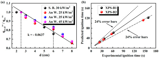 Theoretical heat fluxes obtained from Equation (3) exhibit an approximate linear relationship with the measured heat fluxes in a distance range of 2.5–6 cm. As the thickness of XPS melts is too thin to act as the thermally thick samples, the ignition time is proved to have a relation with [34]: