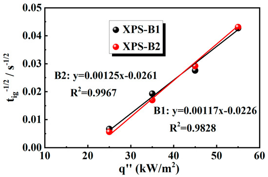 The critical heat flux obtained from the cone calorimeter is a characteristic parameter to describe the ignitability of the materials. Figure 5 represents the relationship between ignition time and external radiance for various fire−retardant levels of XPS. The linear curve fitting is conducted with the square root of the inverse of the ignition time of XPS. It is worth noting that the slope of the linear equation of XPS−B1 is smaller than that of XPS−B2, indicating that the ignition time of XPS−B1 is more significantly affected by external heat flux density compared to other samples. This phenomenon may be related to the material structure and thermal response characteristics of XPS−B1.