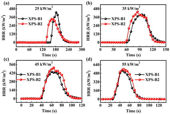 As depicted in Figure 6 and Table 2, when the thermal radiation intensity escalates from 25 kW/m2 to 55 kW/m2, the PHRR of XPS−B1 rises from 428 kW/m2 to 535 kW/m2, marking an increase of 25%. Conversely, the PHRR of XPS−B2 surges from 348 kW/m2 to 579 kW/m2, reflecting a substantial increase of 66.38%. This suggests that an intensified thermal radiation intensity markedly augments the release of heat during combustion, consequently amplifying the fire risk. In general, the incorporation of suitable flame retardants can effectively mitigate the PHRR peak of XPS to a certain extent, signifying an enhancement in the material’s fire resistance. As illustrated in Figure 6b–d, under identical thermal radiation intensities, the PHRR value of XPS−B1 is notably lower than that of the XPS−B2 sample, attributable to the superior flame retardancy of samples with elevated flame retardant content. However, Figure 6a indicates that the PHRR value of XPS−B1 is unexpectedly higher than that of XPS−B2, which may be attributed to the insufficient low heat flux to activate the flame retardant’s maximum efficacy, leading to a limited suppressive effect on the combustion behavior.