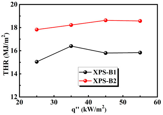 For XPS, the total heat release (THR) is intricately linked to factors such as sample mass loss, the effective combustion heat of volatiles, and combustion efficiency. Empirical evidence suggests that while the THR of the two materials fluctuates under various thermal radiation intensities, the overall pattern remains relatively stable, suggesting that the total heat emitted by the materials during combustion is comparatively consistent. As depicted in Figure 7, an escalation in external heat flux exerts a definable influence on the THR of XPS. At a lower thermal radiation intensity of 25 kW/m2, the THR values for XPS−B1 and XPS−B2 are 15.04 MJ/m2 and 17.83 MJ/m2, respectively, indicating a slower combustion process and more restrained heat release under these conditions. However, with an increase in external heat flux, the THR value incrementally rises, signifying that a higher heat flux hastens the combustion of XPS, diminishes the material’s flame retardant efficacy, and liberates additional heat. This observation can be ascribed to the high heat flux intensifying the melting and thermal decomposition of XPS, leading to a marked upsurge in the production rate of combustible gases and the effective heat of combustion.