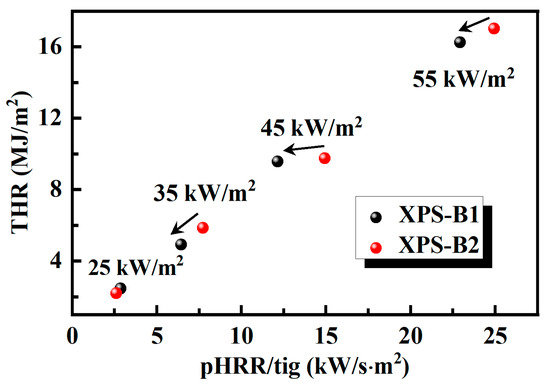 The heat release rate and total heat release are pivotal factors in assessing fire hazards. To encapsulate a comprehensive index of material fire behavior, Petrella [42] introduced a holistic index that accounts for both the fire load and the fire growth rate. By examining the ratio of total heat release (THR) to the product of peak heat release rate (PHRR) and ignition time (tig), a more systematic and comprehensive evaluation of fire hazards can be achieved. The fire thermal hazard assessment of XPS series materials under varying heat flux conditions, as illustrated in Figure 8, reveals the fluctuating efficacy of flame retardants under different heat fluxes. The experimental data indicate that the incorporation of flame retardants substantially diminishes the THR value of XPS and significantly retards the fire growth rate, thereby mitigating its overall fire hazard.