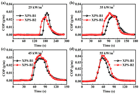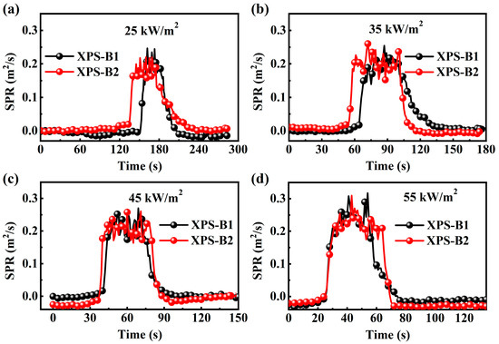 Furthermore, the emission of smoke during combustion is a critical factor influencing the progression and harmfulness of fires. Studies have demonstrated that the smoke release rate among different XPS materials varies, influenced by the chemical composition of the material, the quantity of flame retardant incorporated, and the combustion conditions. As depicted in Figure 9, the smoke release rate of XPS−B2 samples, which have a lower flame retardancy, tends to escalate prematurely and swiftly attain its peak. However, this trend diverges under high heat flux conditions of 55 kW/m2, suggesting that the disparity in smoke release rates is attenuated under such intense heat fluxes. Moreover, with the augmentation of thermal radiation intensity, the Peak Smoke Production Rate (PSPR) for both materials incrementally rises. This escalation is attributed to the fact that heightened thermal radiation intensity accelerates the material’s combustion reaction, leading to increased smoke production during the combustion process. At a thermal radiation intensity of 25 kW/m2, the PSPR for XPS−B1 is 0.2460 m2/s, while for XPS−B2, it is 0.2220 m2/s; at an intensified thermal radiation intensity of 55 kW/m2, the PSPR for XPS−B1 escalates to 0.3162 m2/s, and for XPS−B2, it increases to 0.3095 m2/s. These findings underscore that at elevated thermal radiation levels, the combustion of materials generates a greater volume of smoke, thereby presenting more formidable challenges to fire management and suppression efforts.
