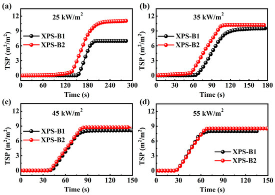 TSP curves for XPS samples under different radiant heat flow with time: (a) 25 kW/m2, (b) 35 kW/m2, (c) 45 kW/m2 and (d) 55 kW/m2.