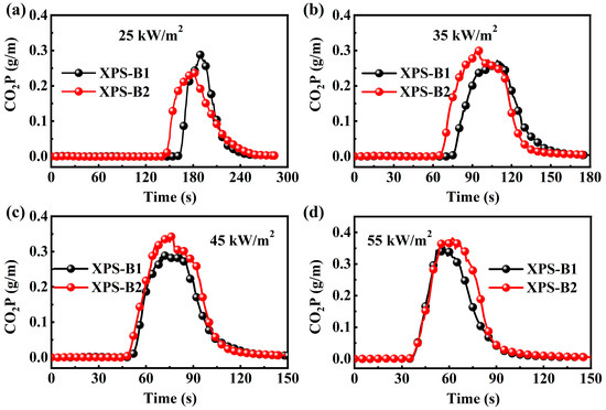 CO2 curves for XPS samples under different radiant heat flows with time: (a) 25 kW/m2, (b) 35 kW/m2, (c) 45 kW/m2 and (d) 55 kW/m2.